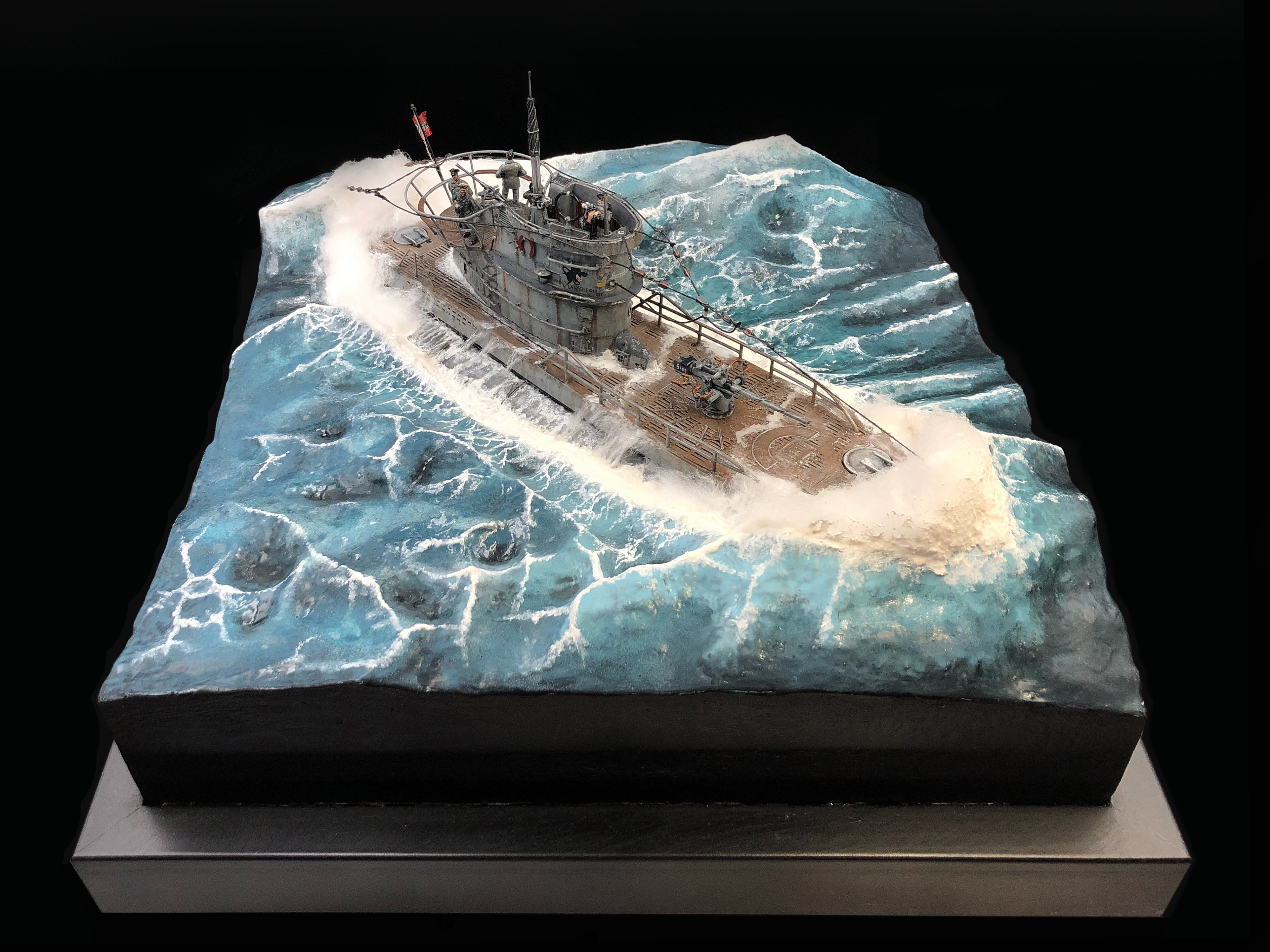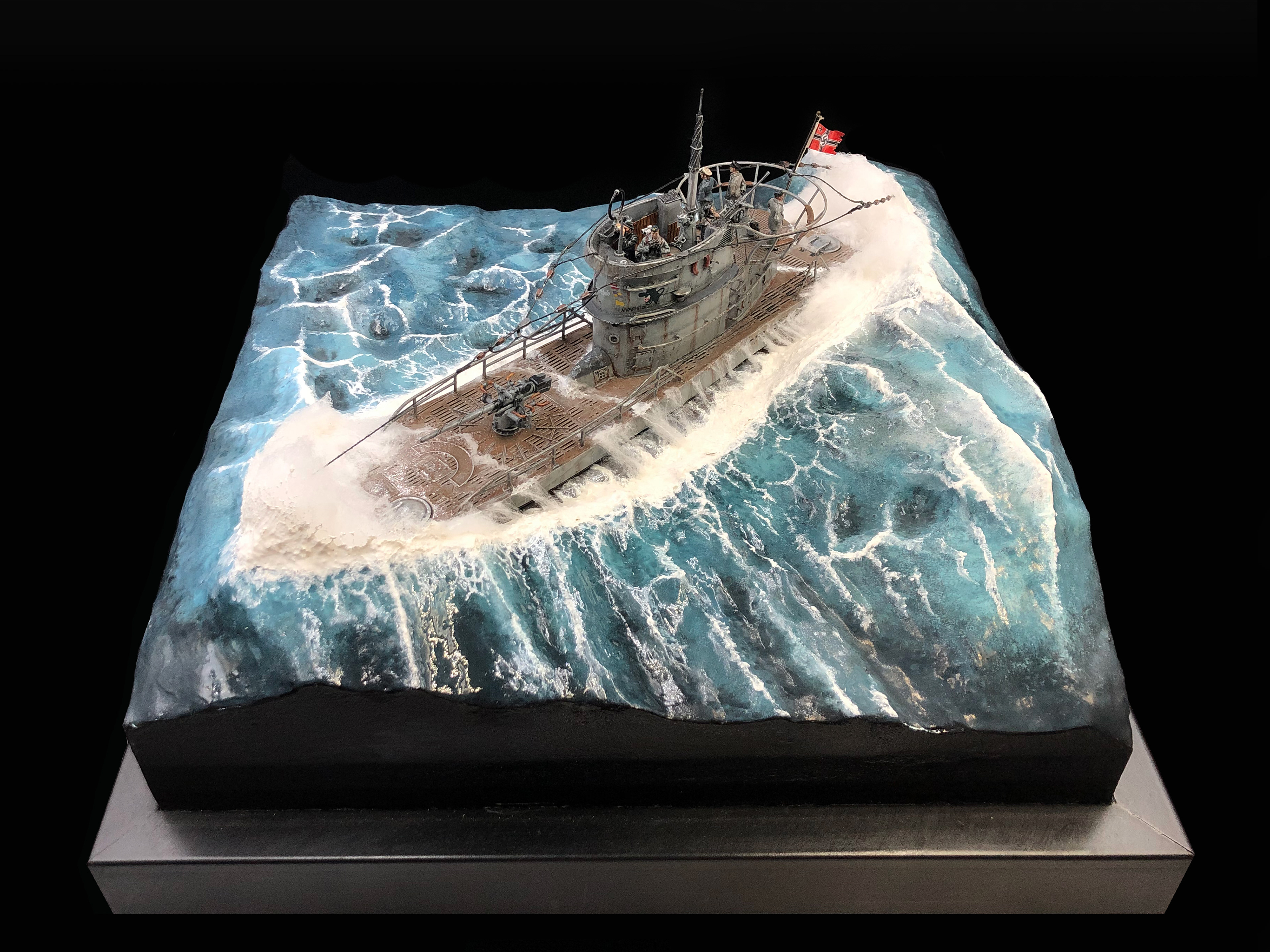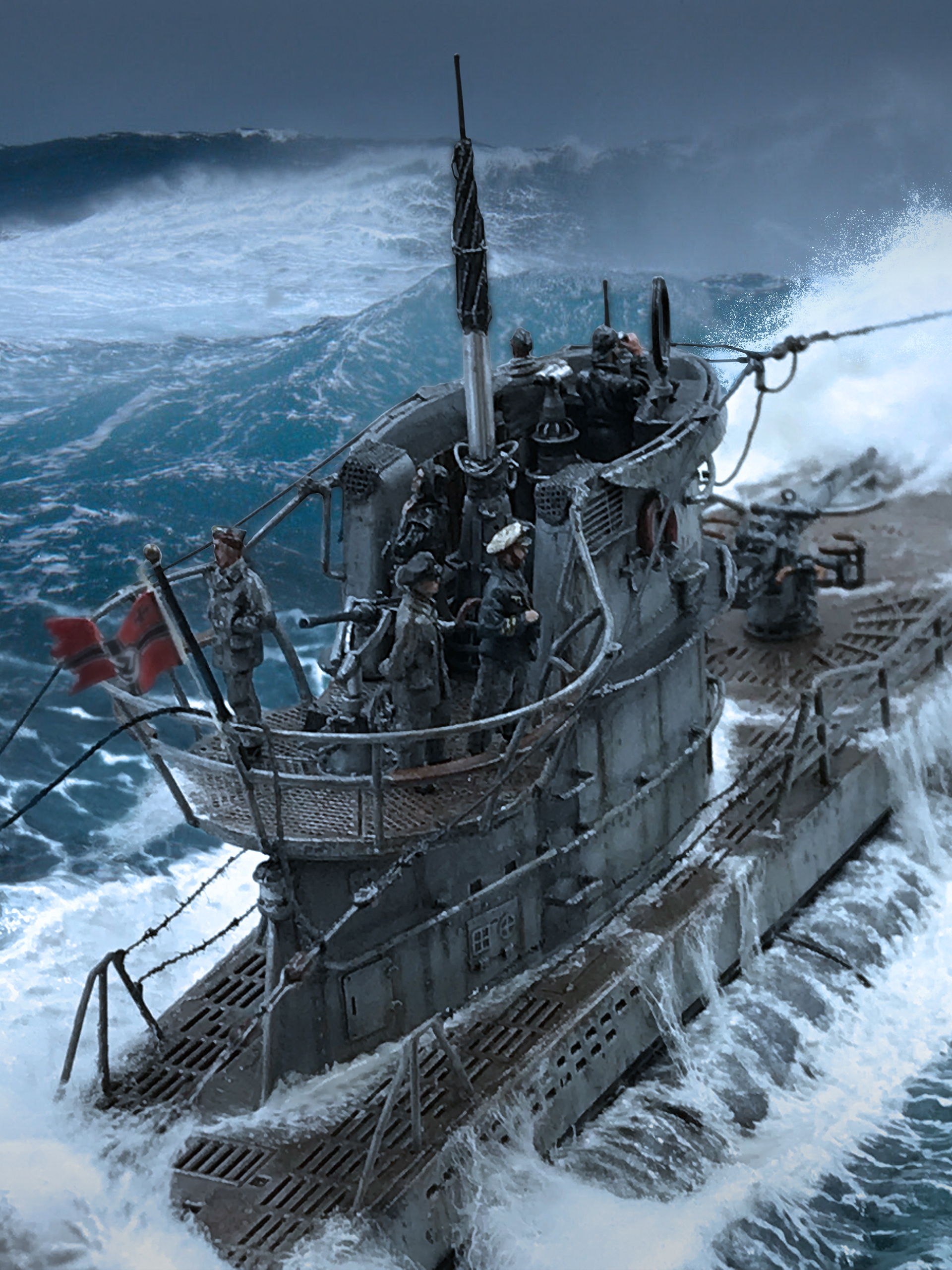 Seascape diorama depicting U-69, a Type VIIC German U-Boat somewhere out on patrol in the rough Atlantic Ocean.