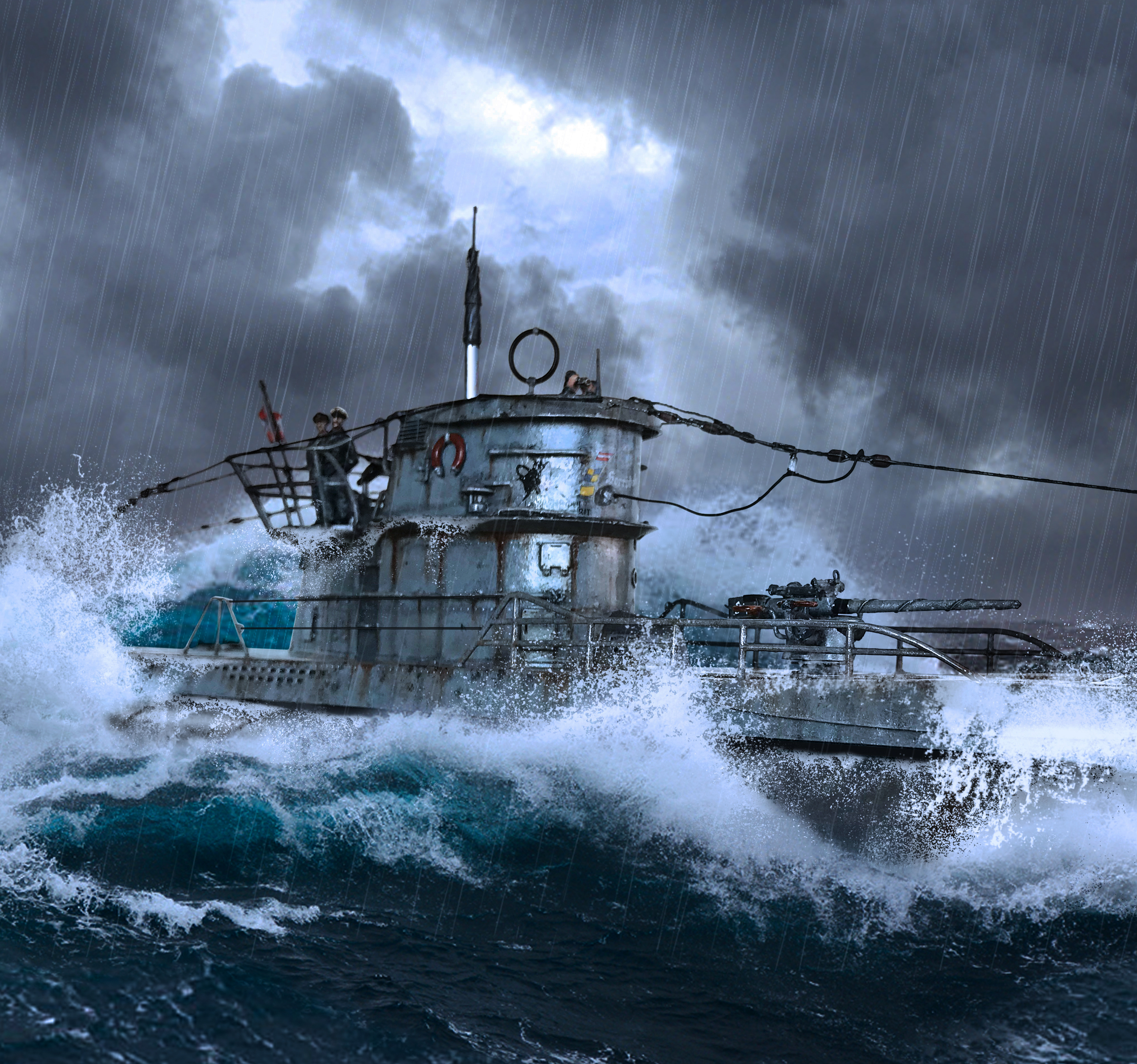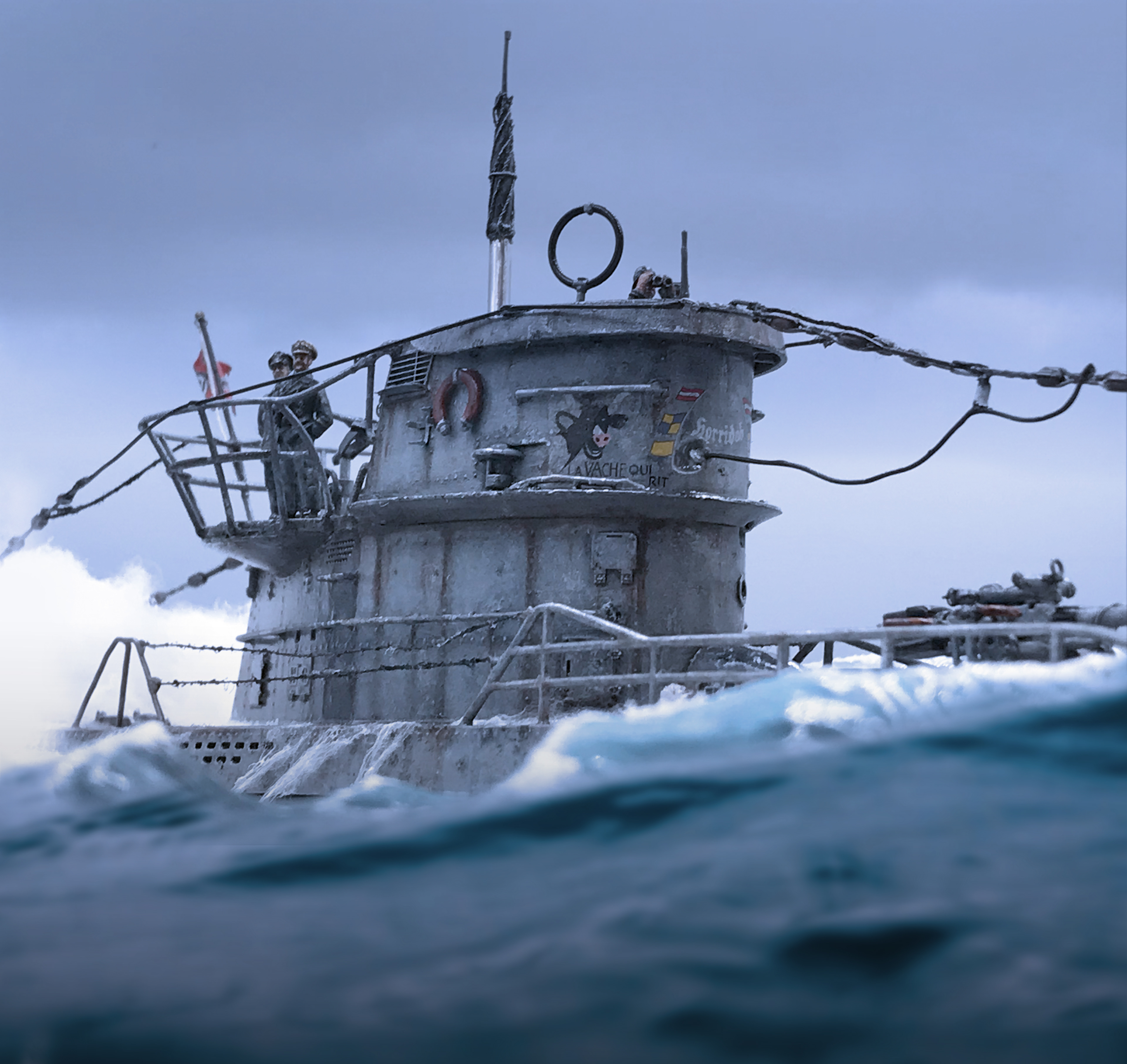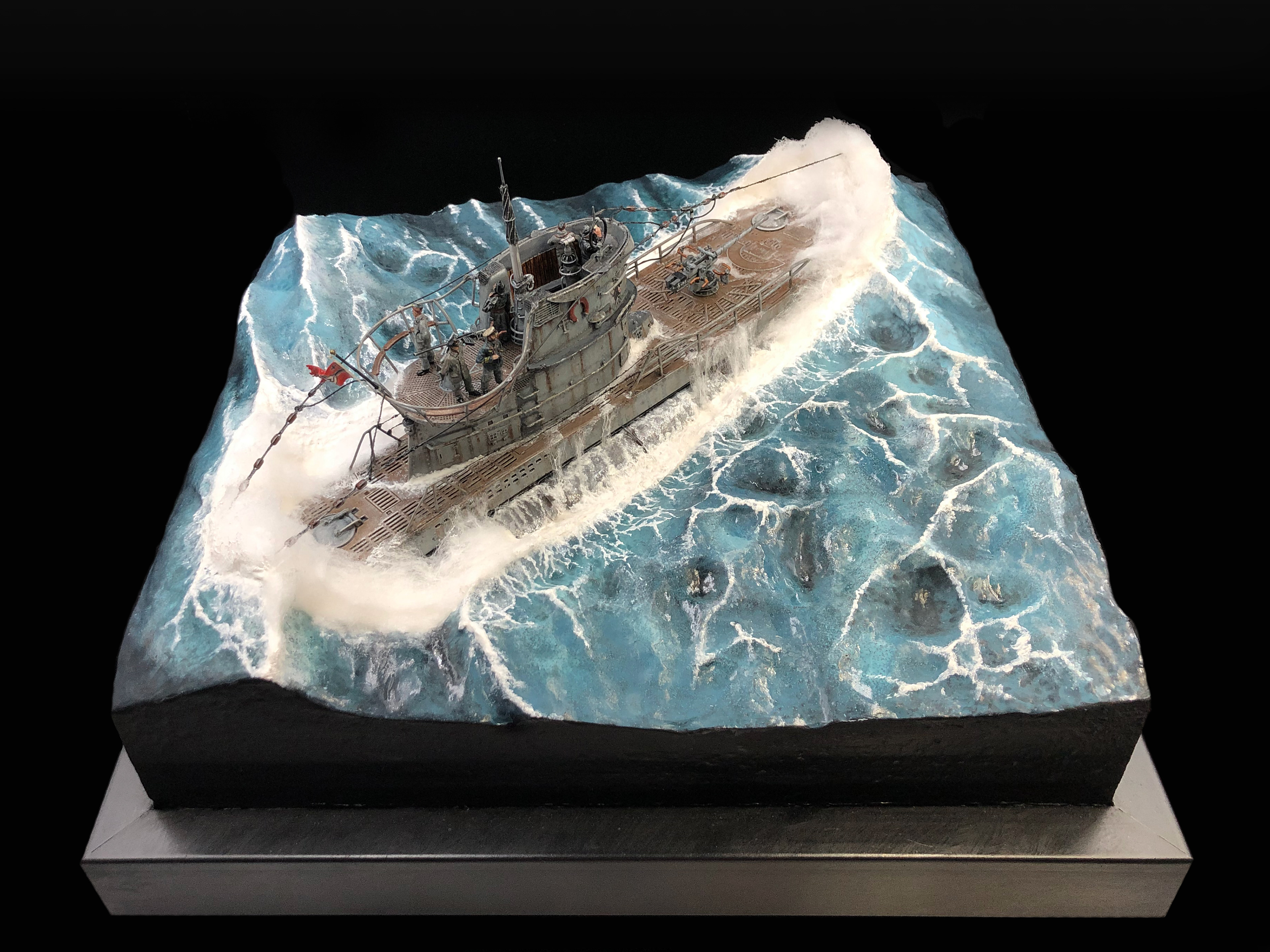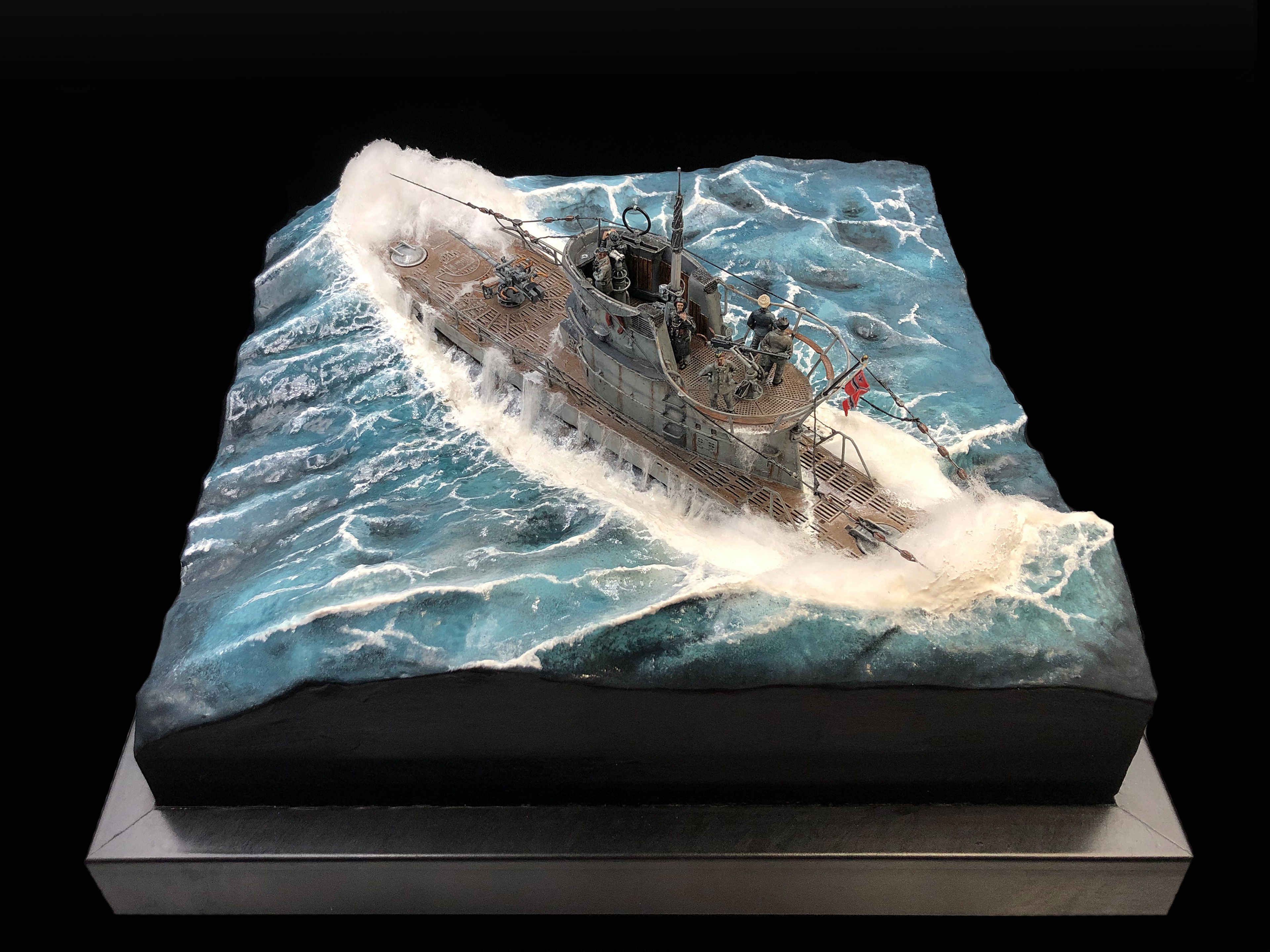 Seascape diorama depicting U-69, a Type VIIC German U-Boat somewhere out on patrol in the rough Atlantic Ocean.