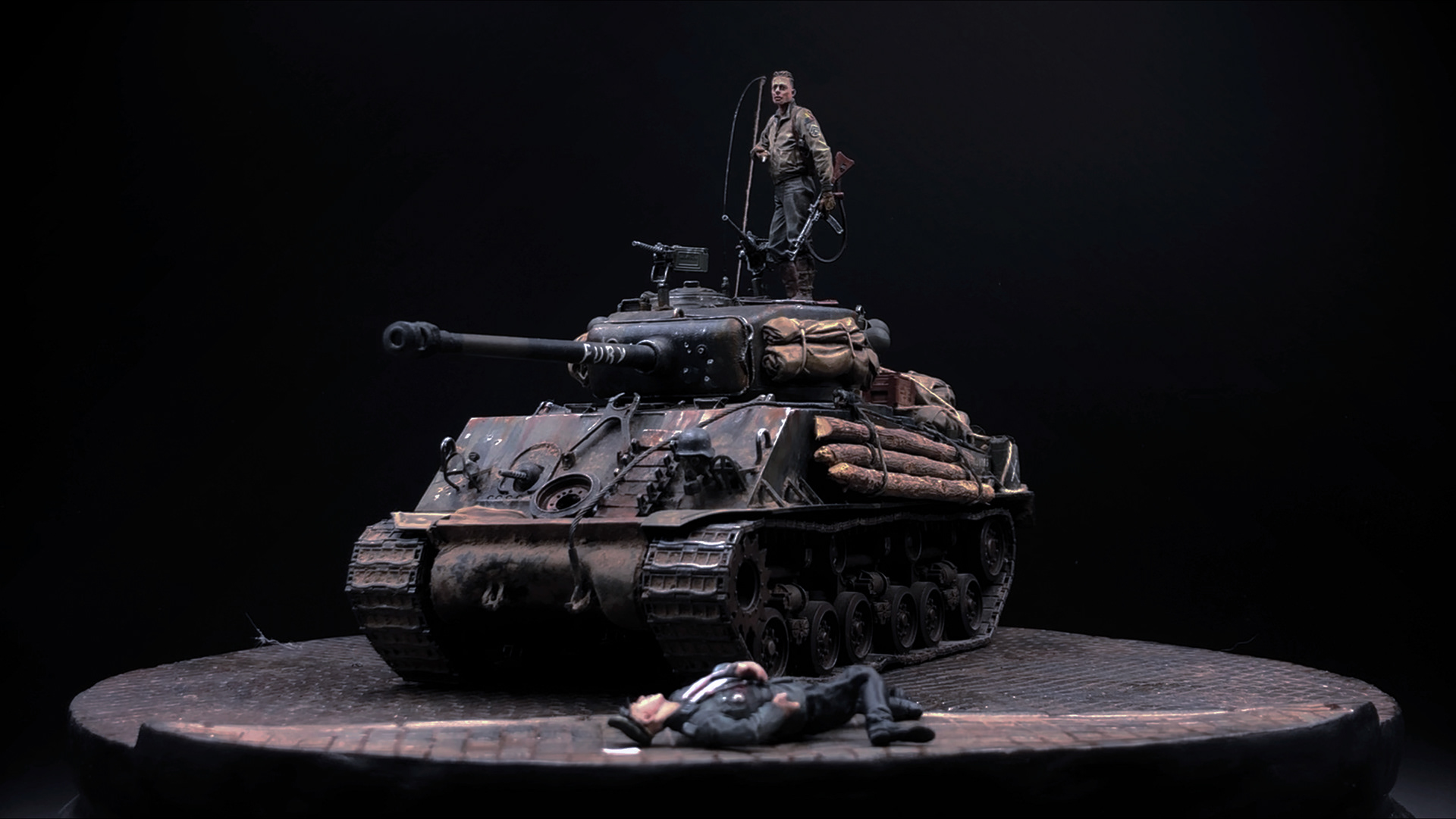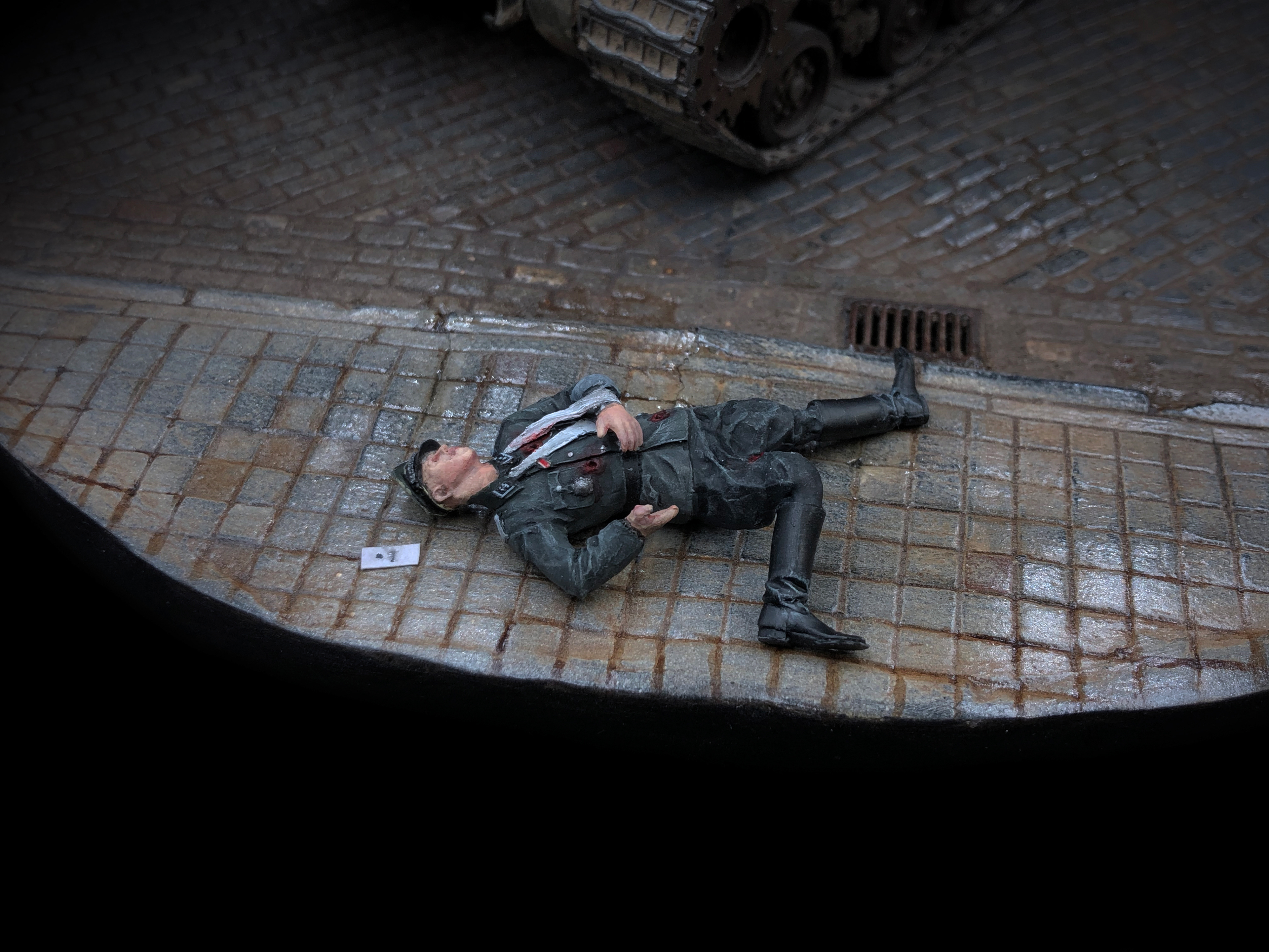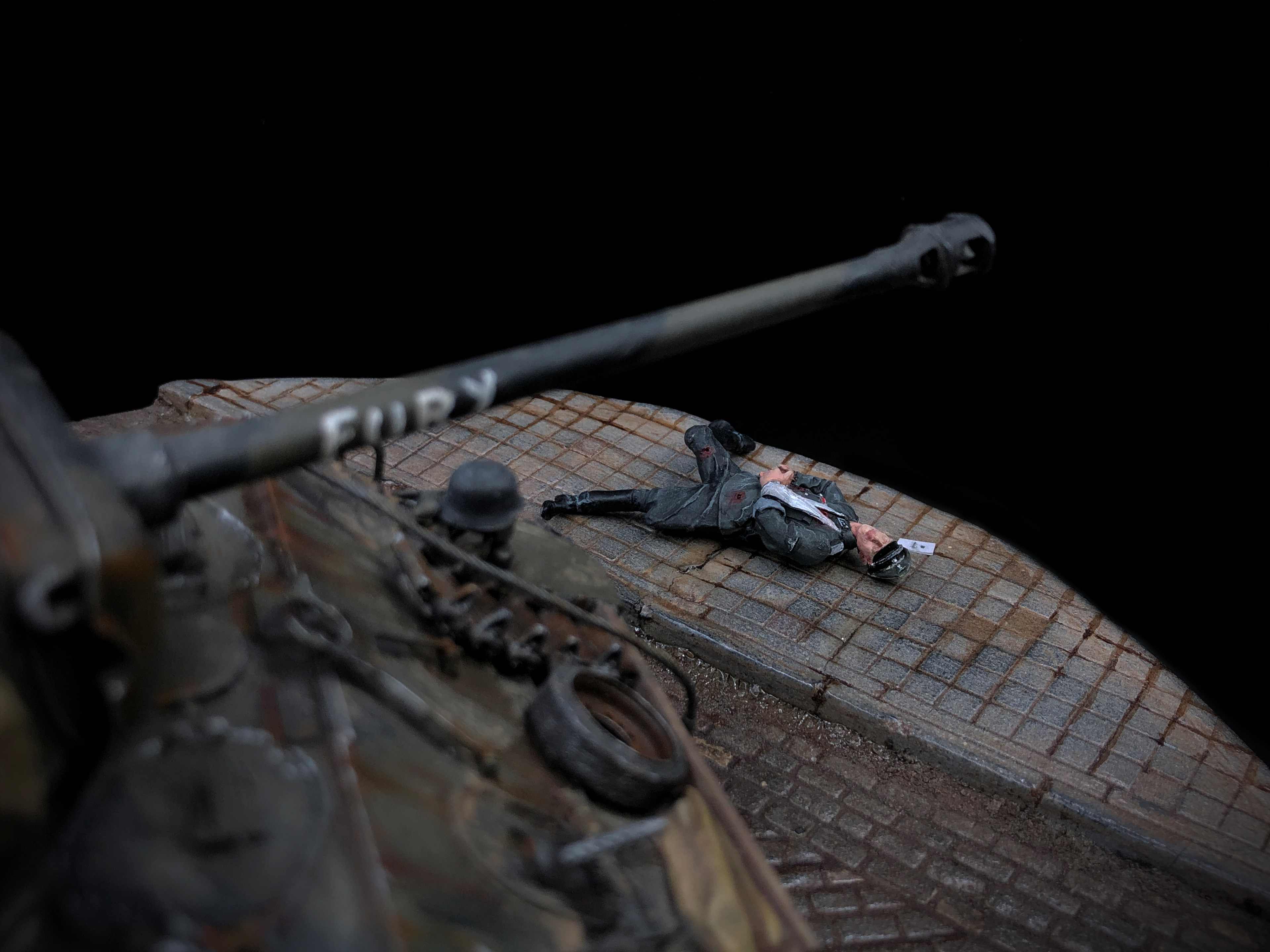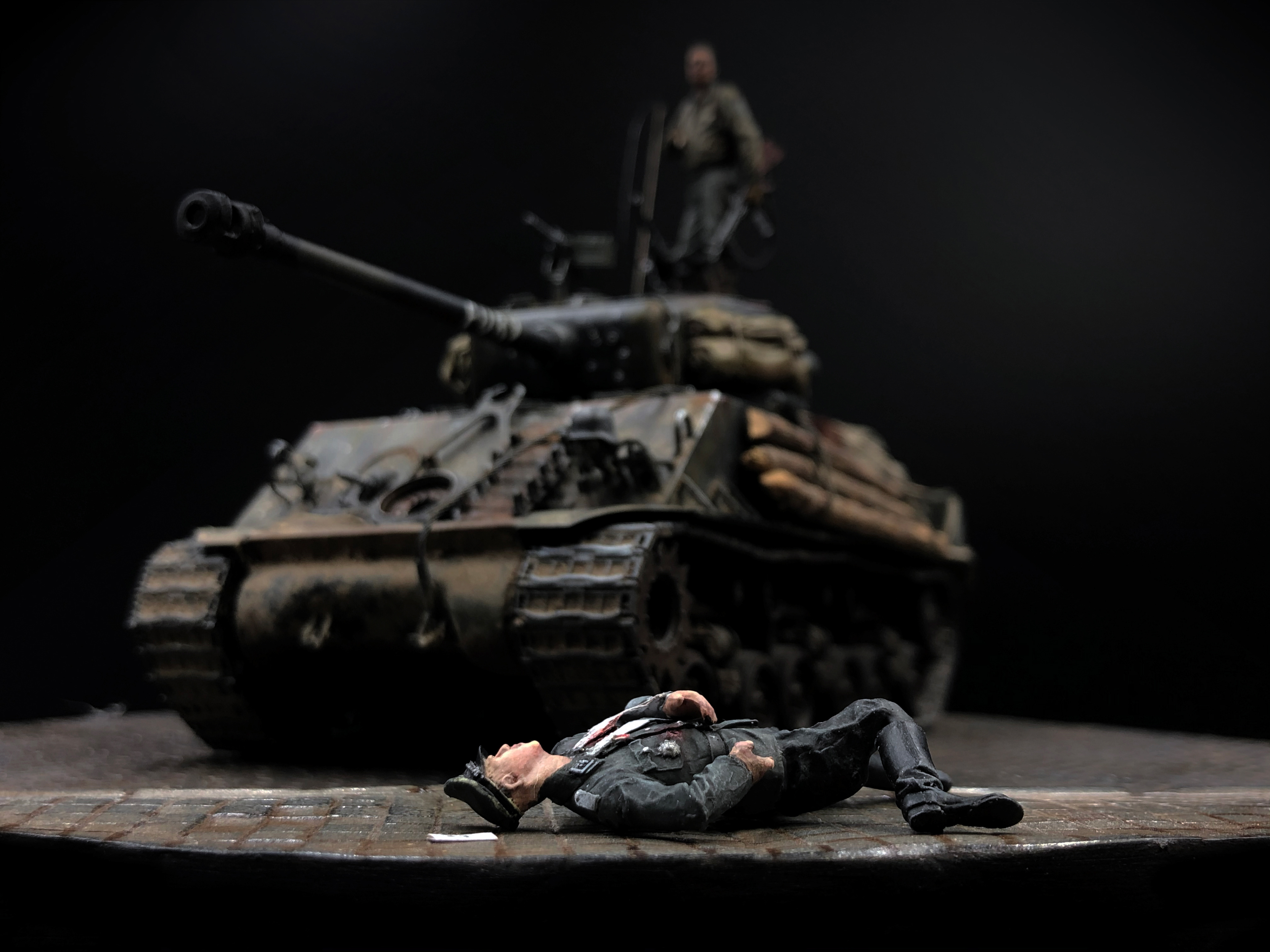 Vignette of an SS officer is executed on the spot in the occupied town square while the U.S. continue their advance into Germany during the final weeks of the war. Inspired by the iconic the scene from the 2014 movie Fury, directed by David Ayer, starring Brad Pitt, Shia LaBeouf, Logan Lerman, Michael Peña, Jon Bernthal, Jason Isaacs and Scott Eastwood.