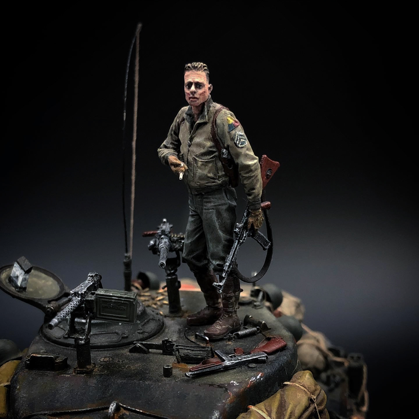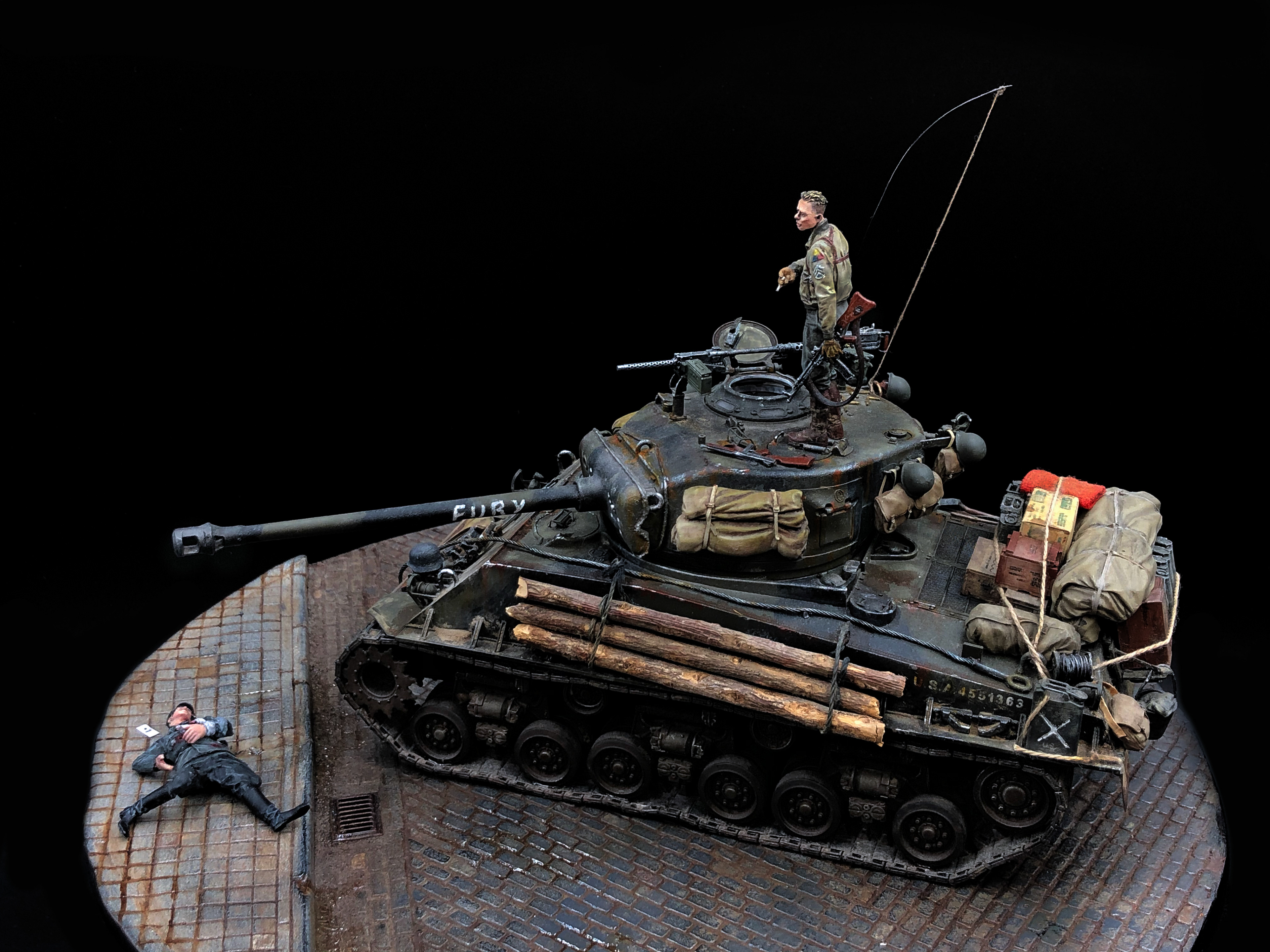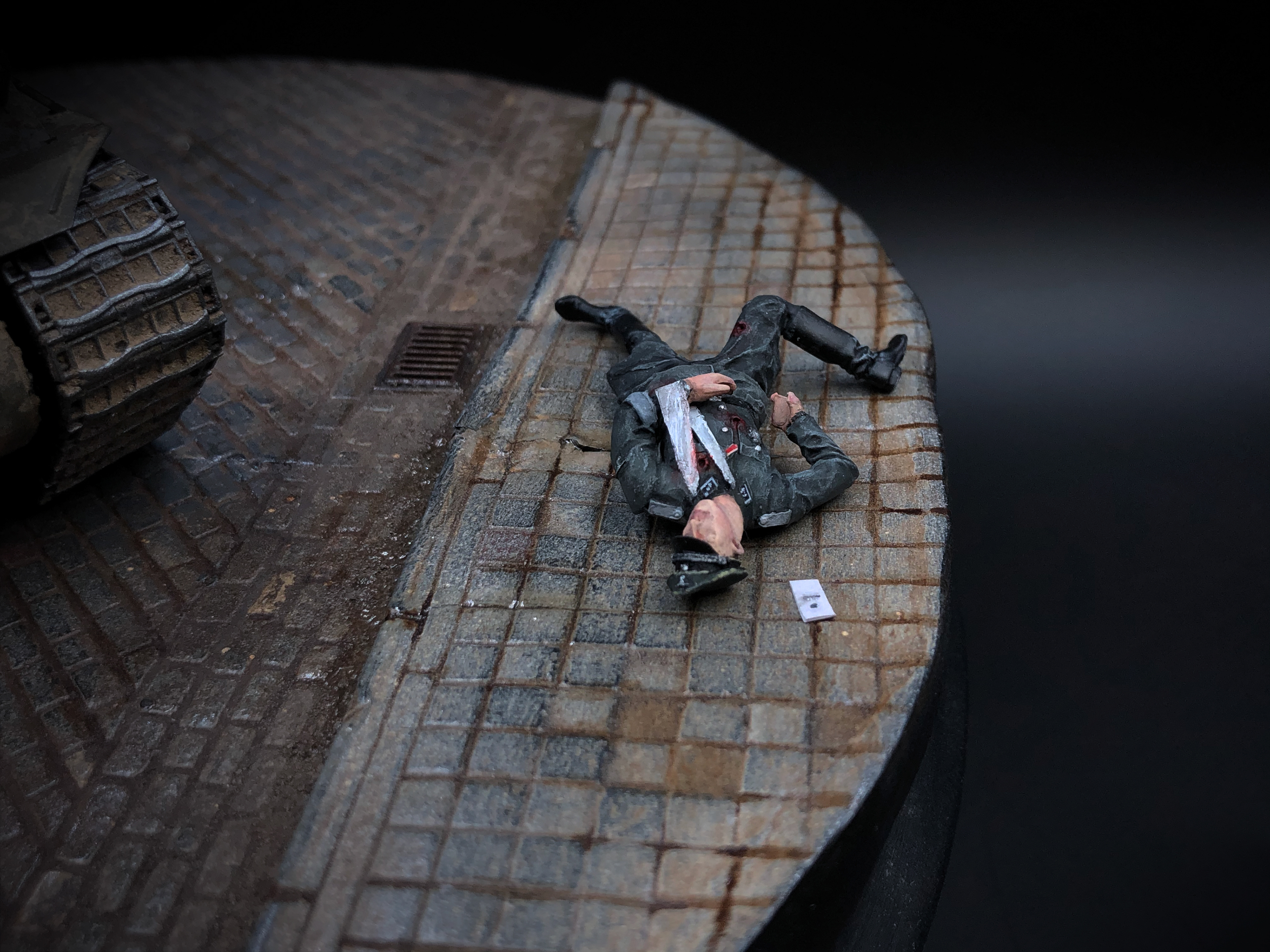 Vignette of an SS officer is executed on the spot in the occupied town square while the U.S. continue their advance into Germany during the final weeks of the war. Inspired by the iconic the scene from the 2014 movie Fury, directed by David Ayer, starring Brad Pitt, Shia LaBeouf, Logan Lerman, Michael Peña, Jon Bernthal, Jason Isaacs and Scott Eastwood.
