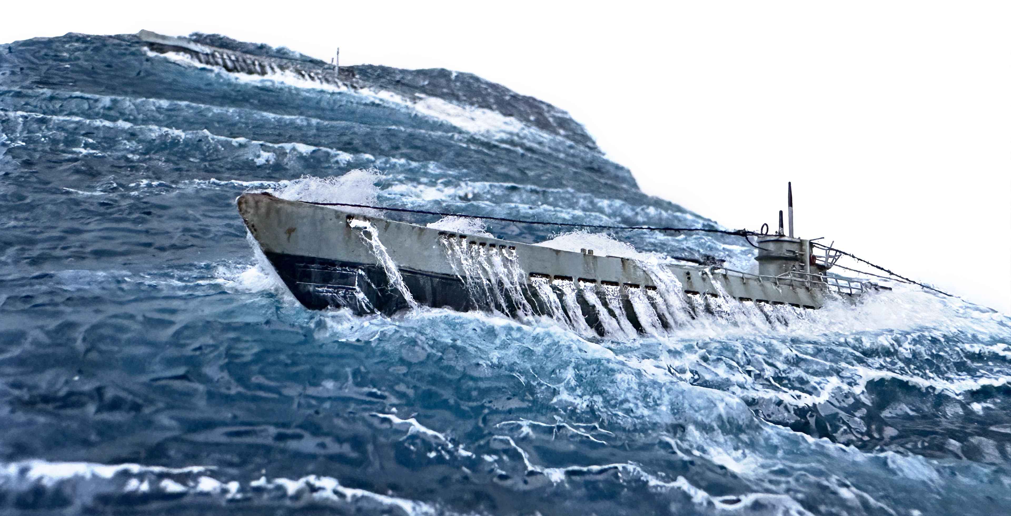 Forced perspective build of two type IX B U-boats somewhere in the Atlantic Ocean, using two scale variants to create a sense of distance between each other.