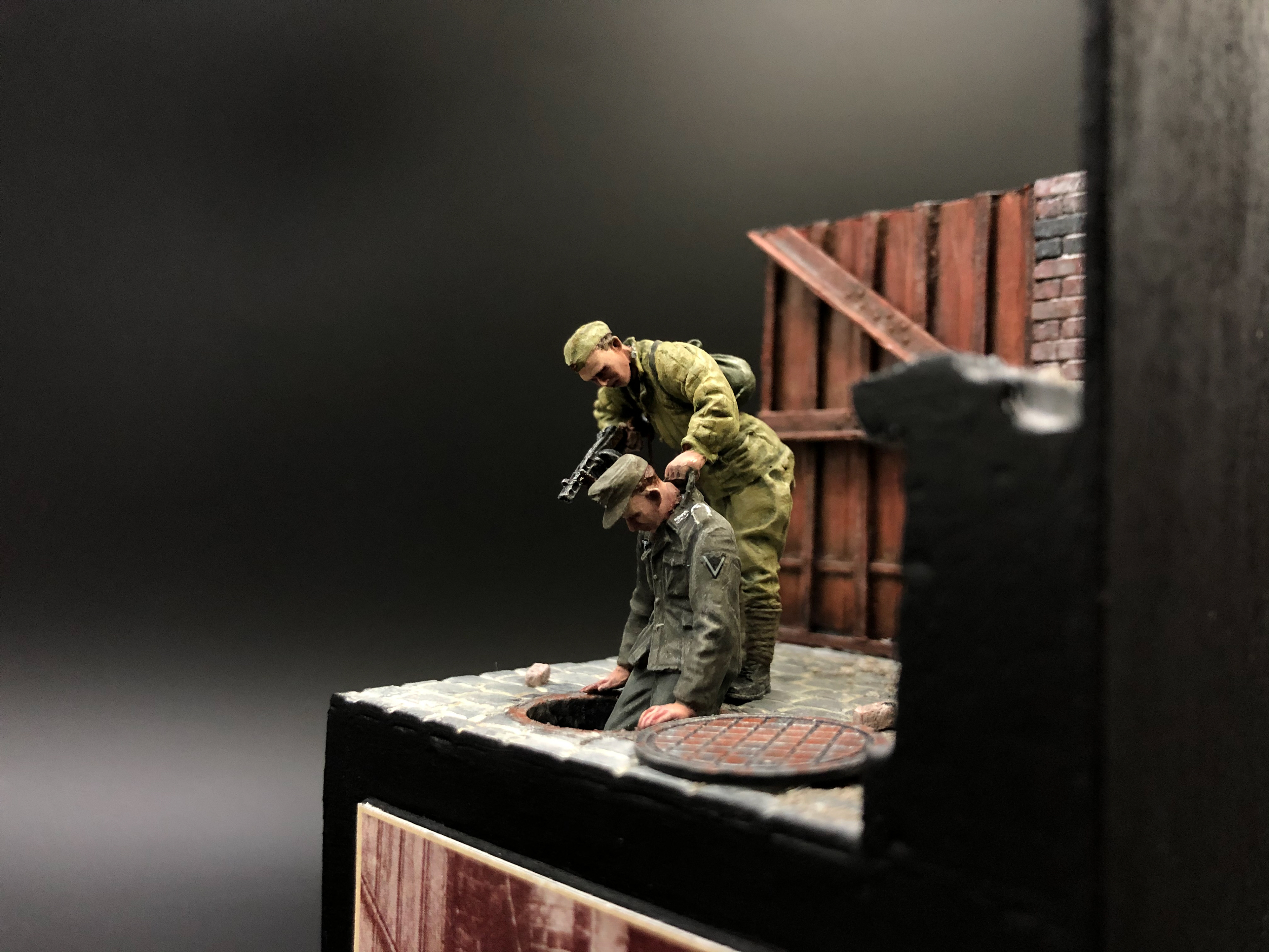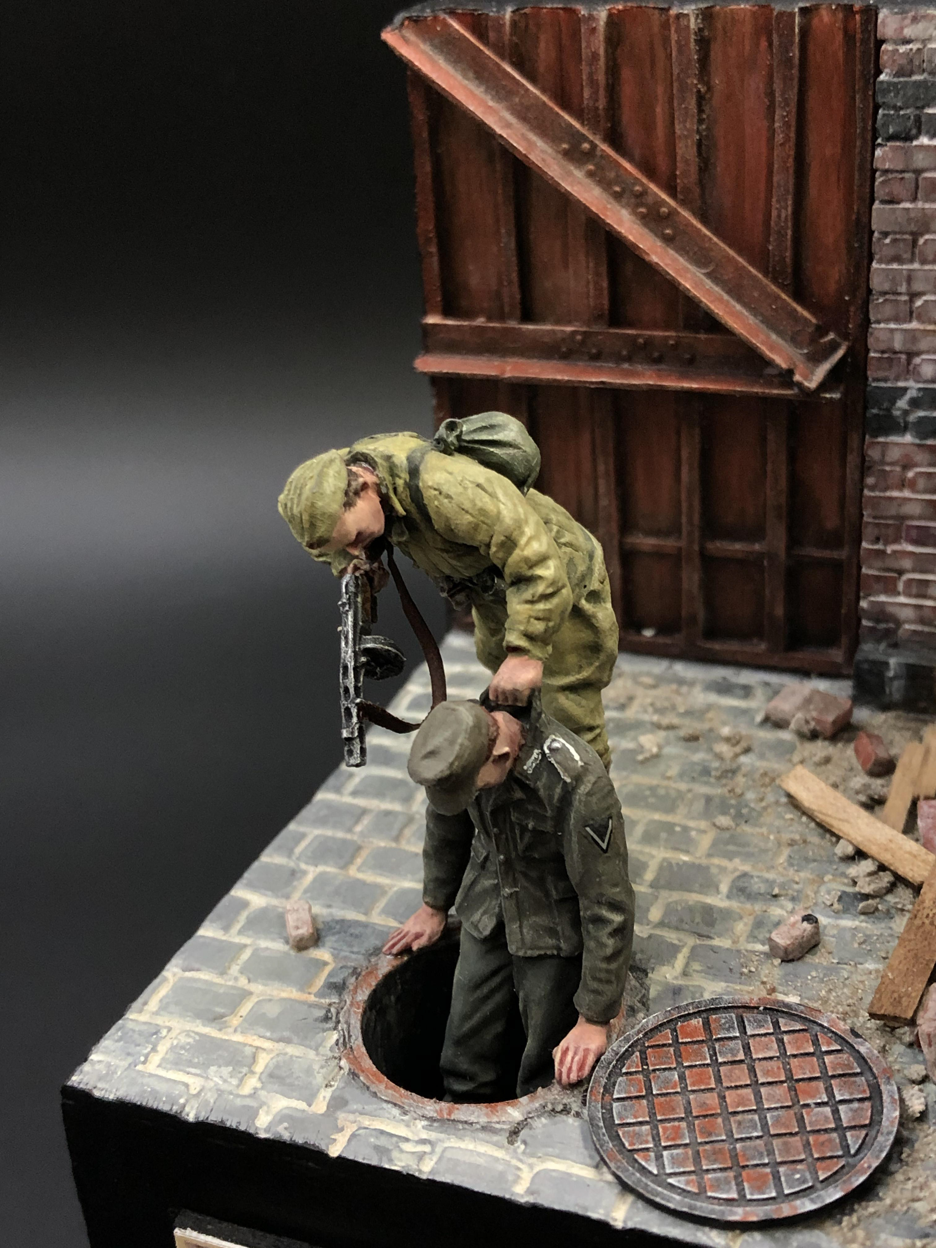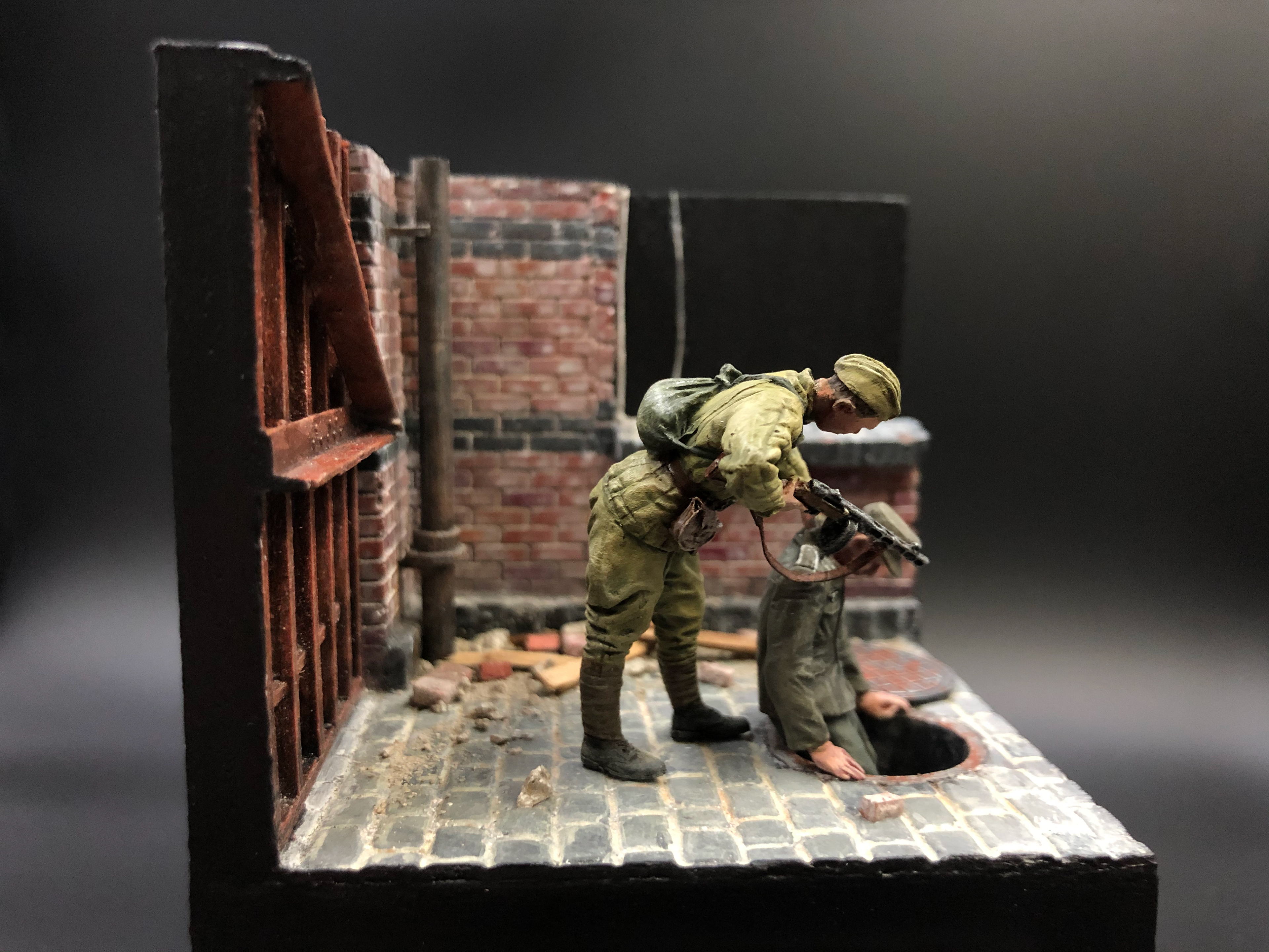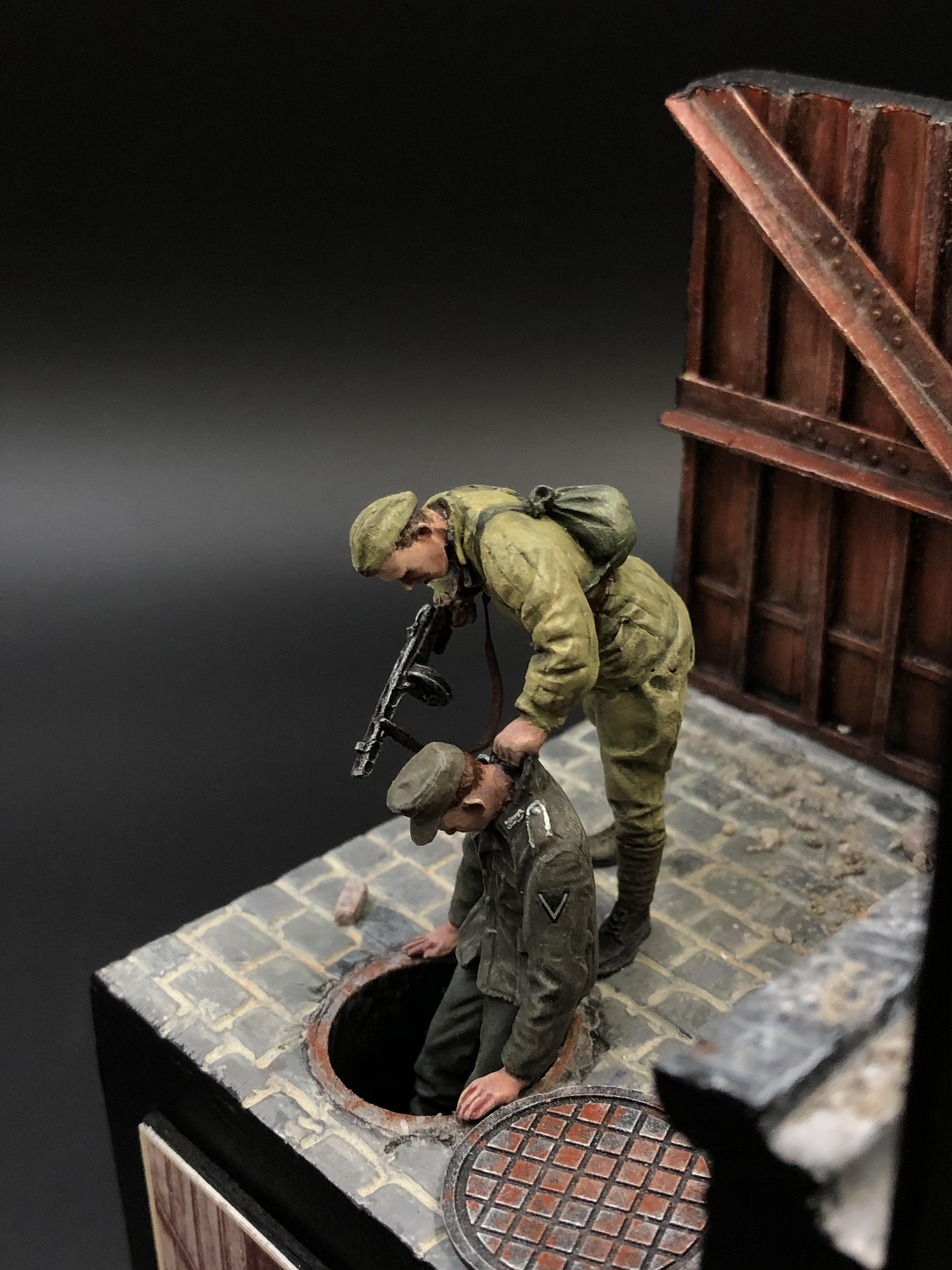 1:35 vignette of a well-known photograph taken during the final days of the Battle of Berlin, 1945. The scene captures a Soviet soldier extracting a German Wehrmacht soldier hiding within a manhole.
