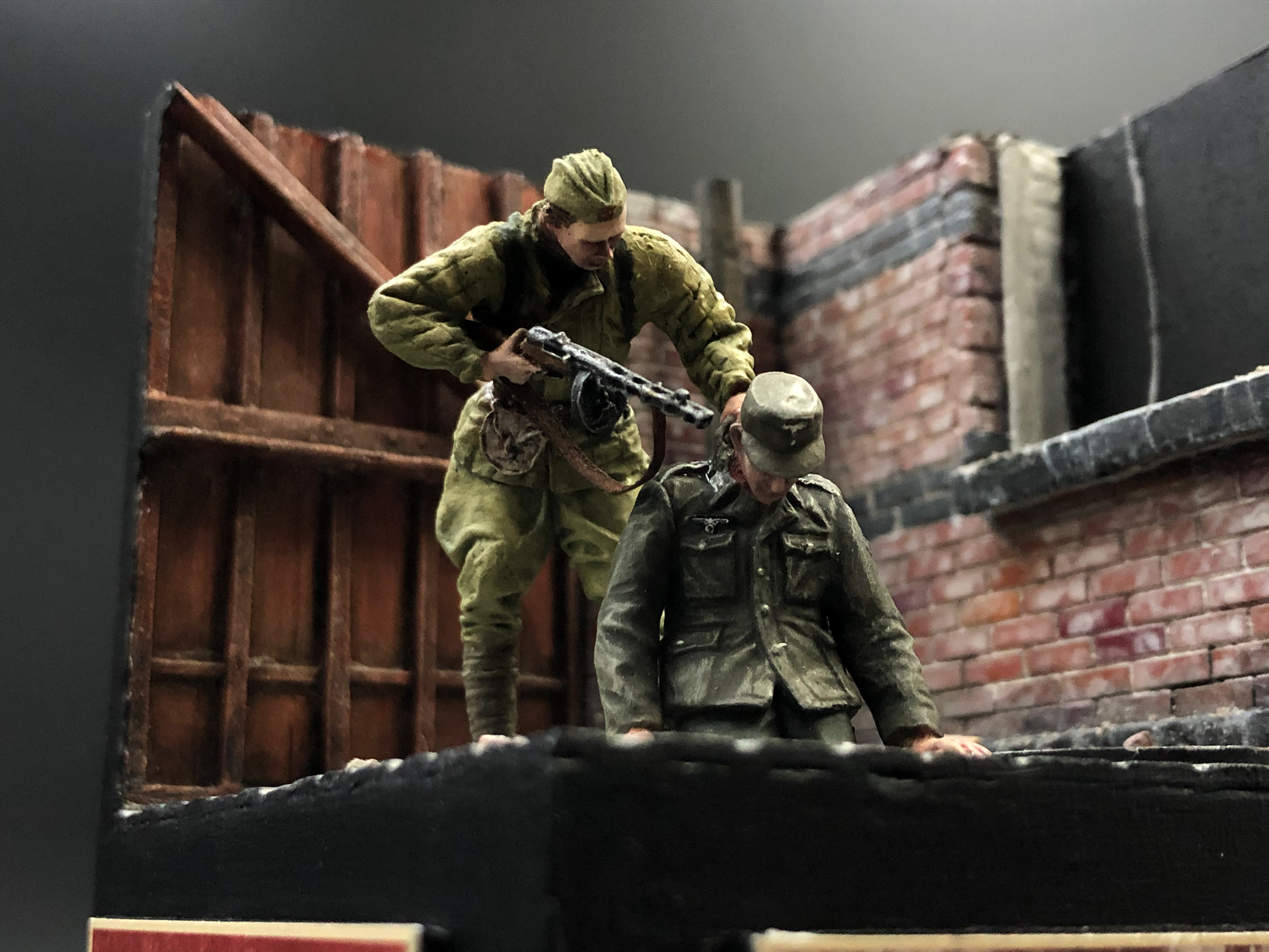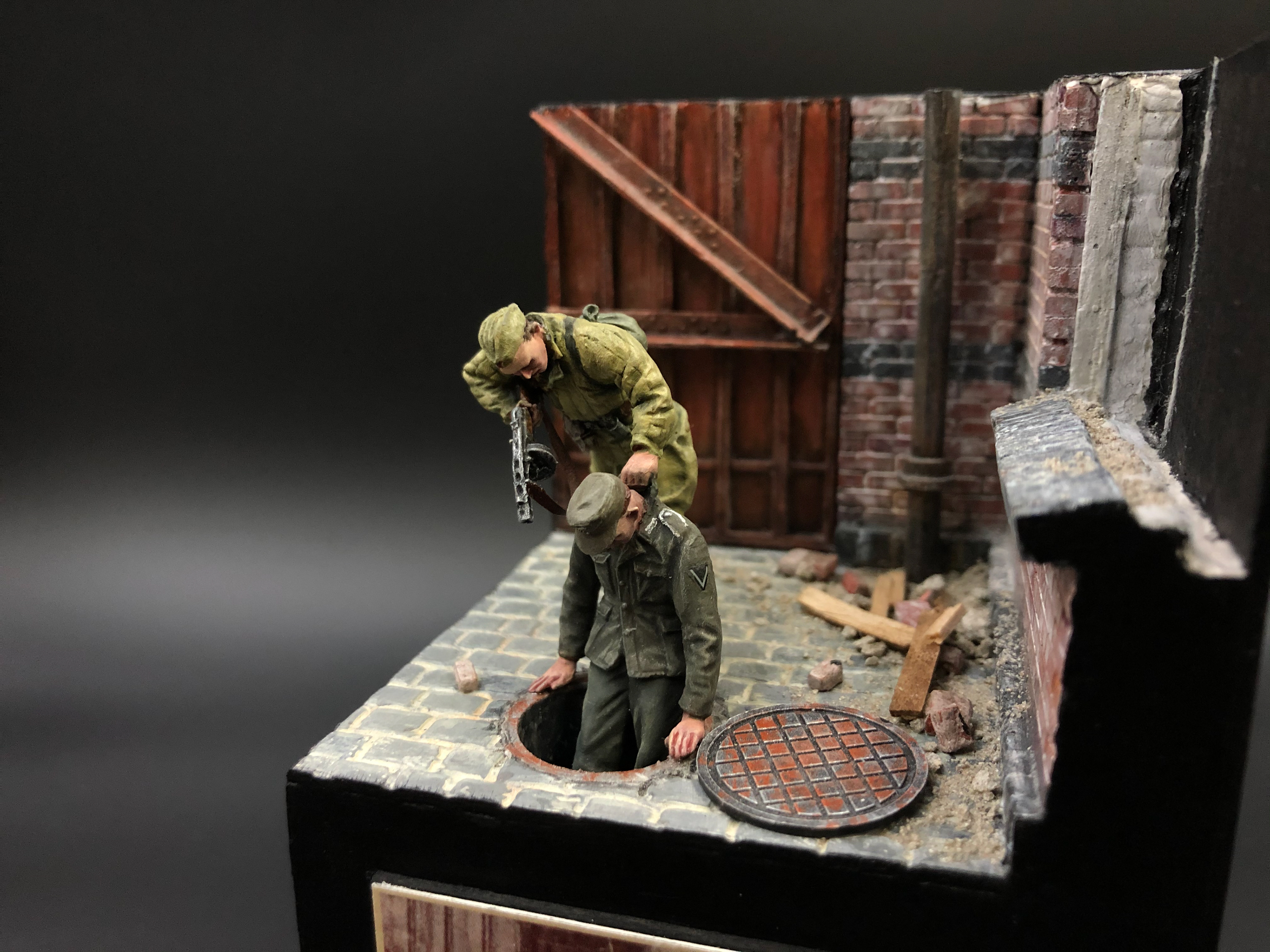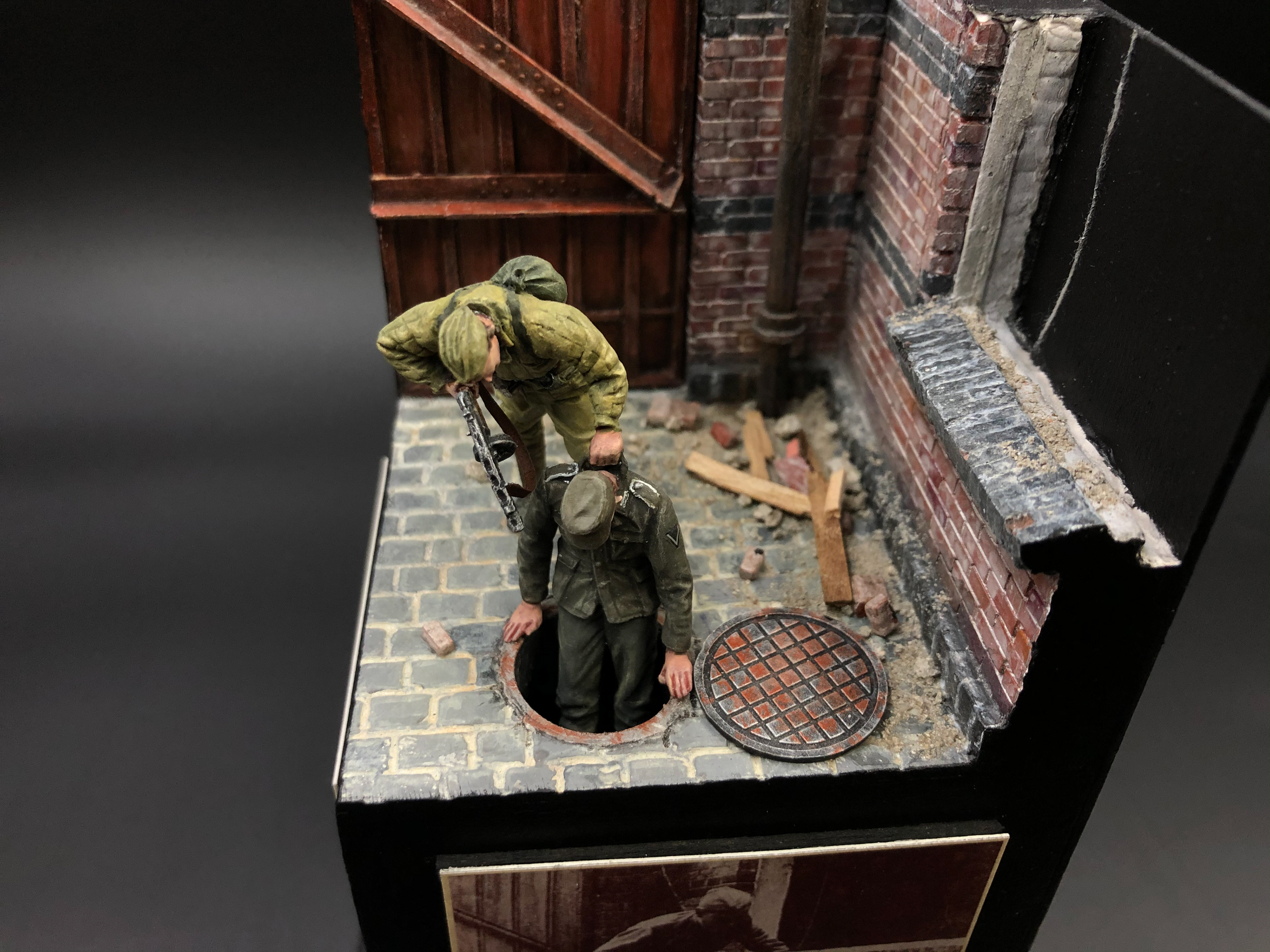 1:35 vignette of a well-known photograph taken during the final days of the Battle of Berlin, 1945. The scene captures a Soviet soldier extracting a German Wehrmacht soldier hiding within a manhole.