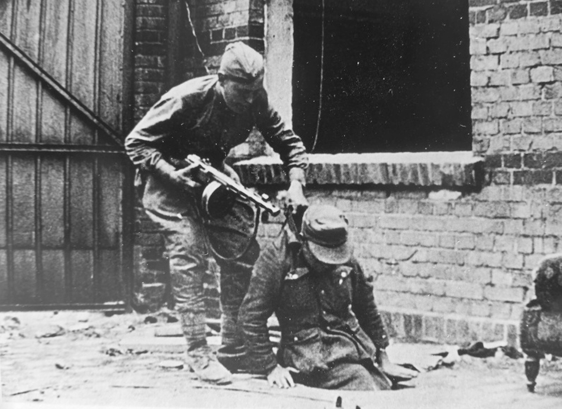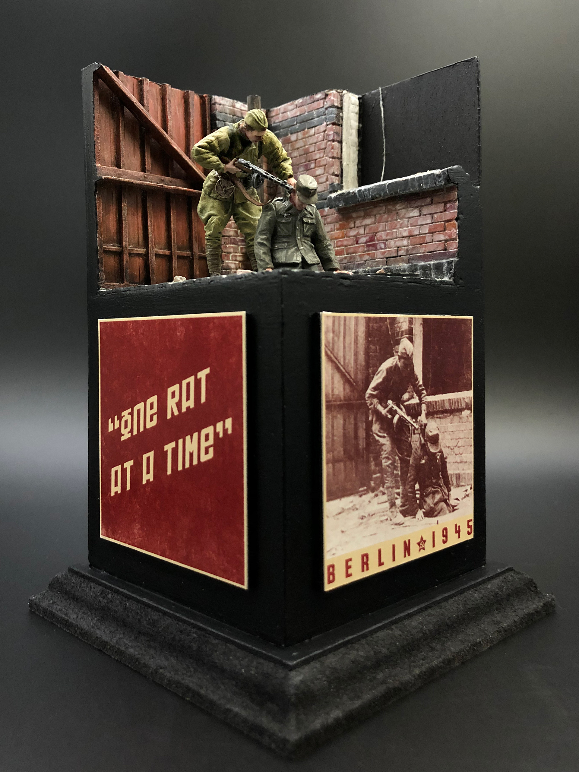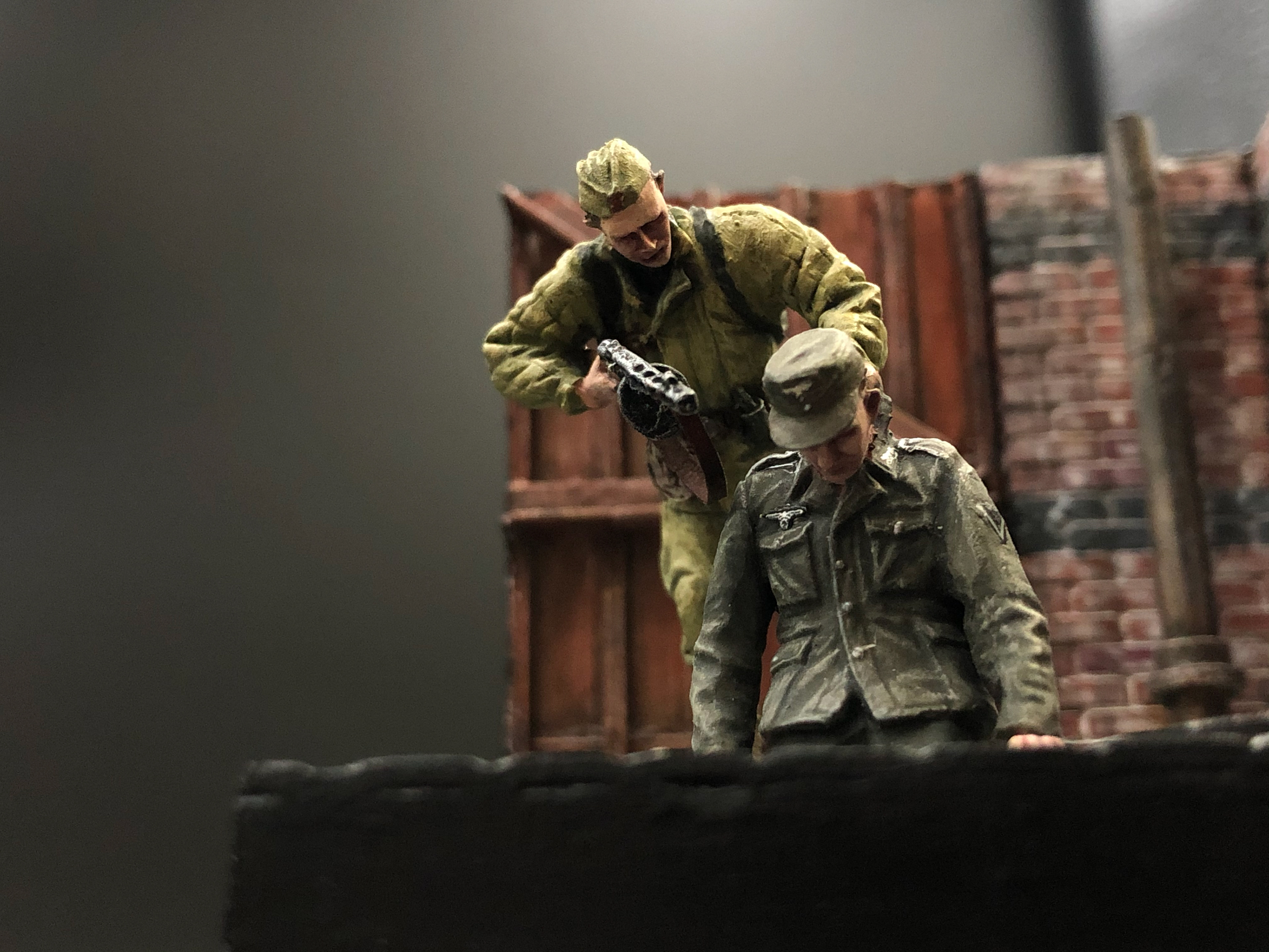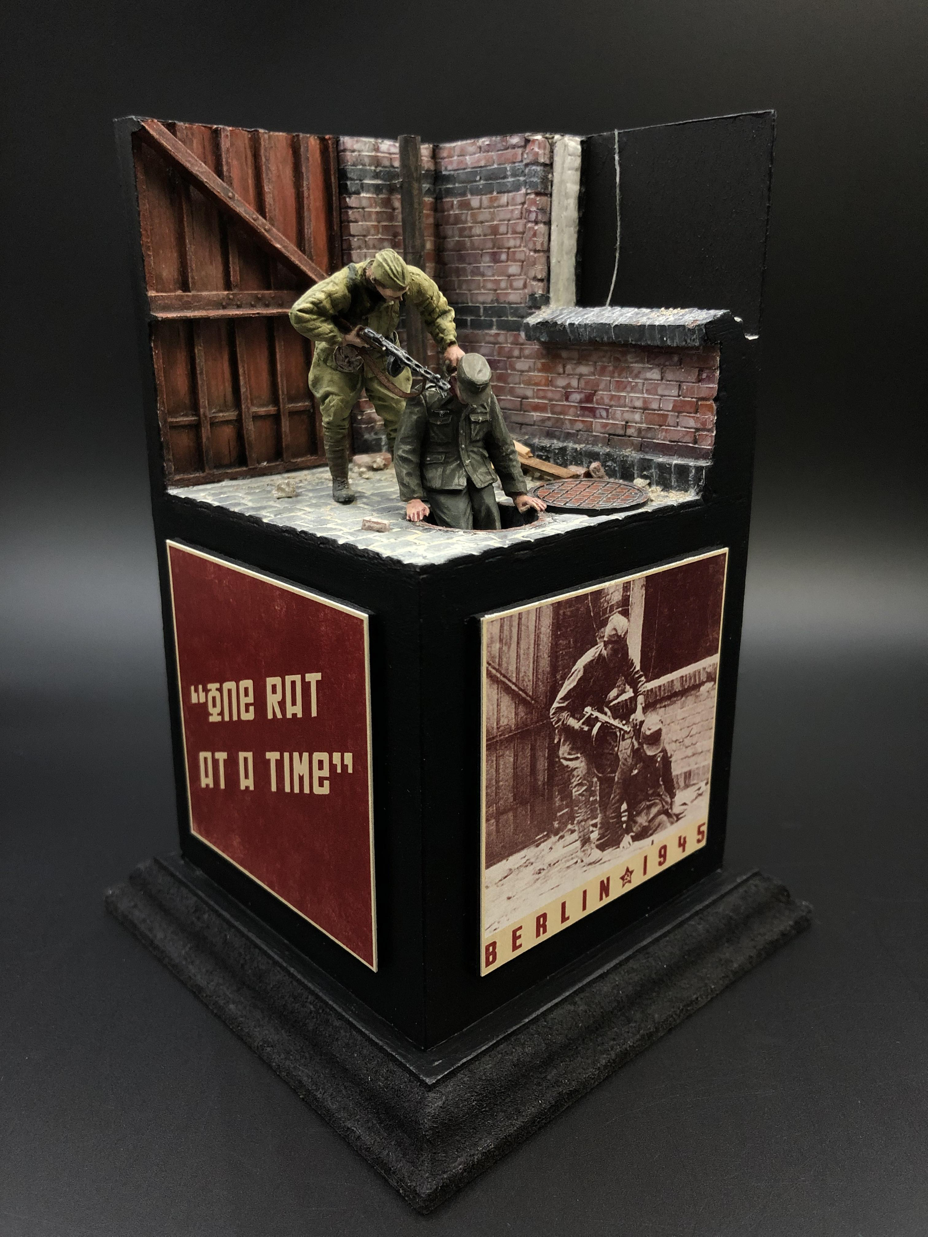 1:35 vignette of a well-known photograph taken during the final days of the Battle of Berlin, 1945. The scene captures a Soviet soldier extracting a German Wehrmacht soldier hiding within a manhole.