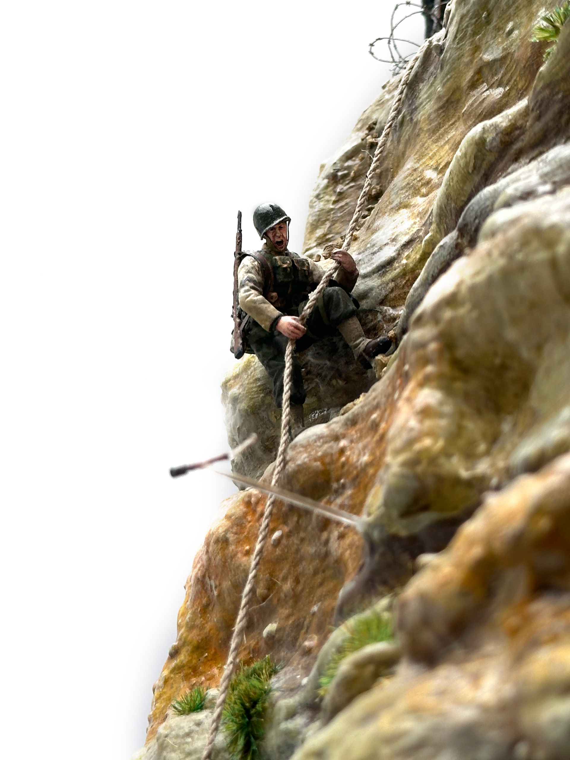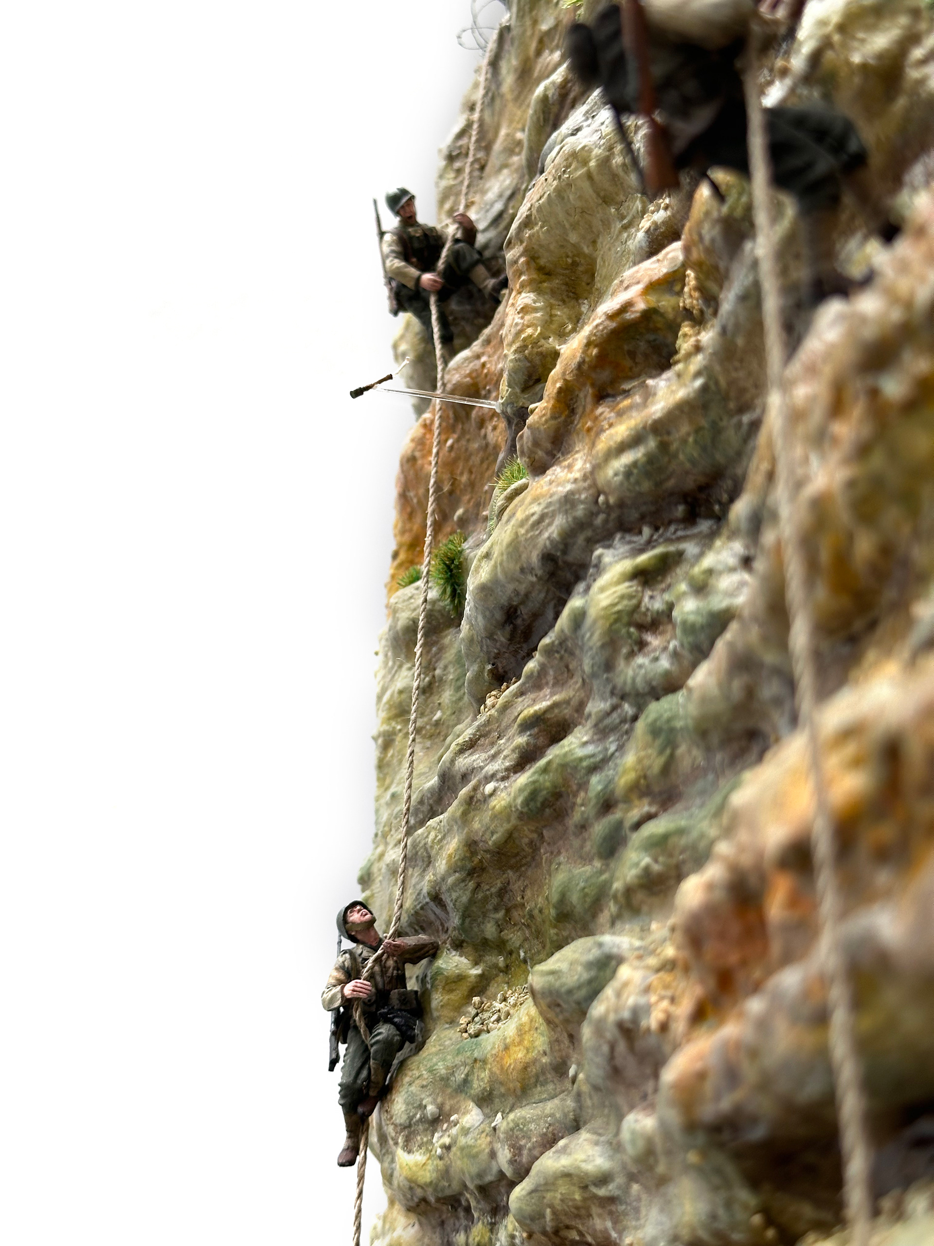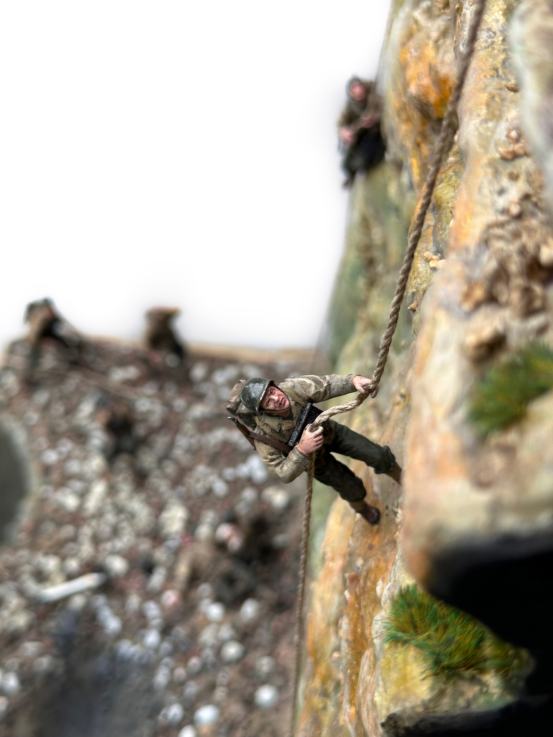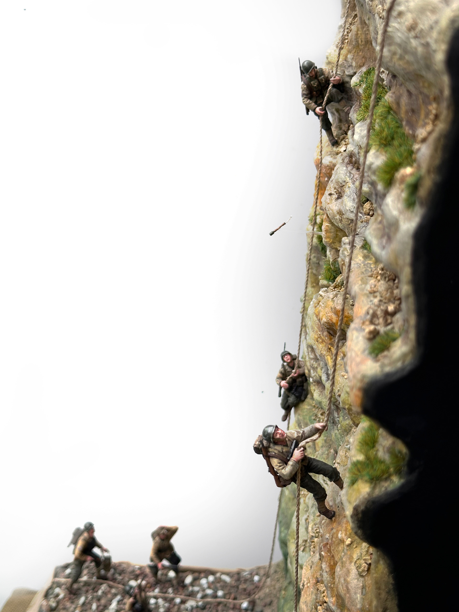 Depiction of the US 2nd Rangers landing at Pointe-du-Hoc and scaling one of the cliff faces while under fire from the startled German defenders above on the morning of the D-Day landings, June 6th, 1944.