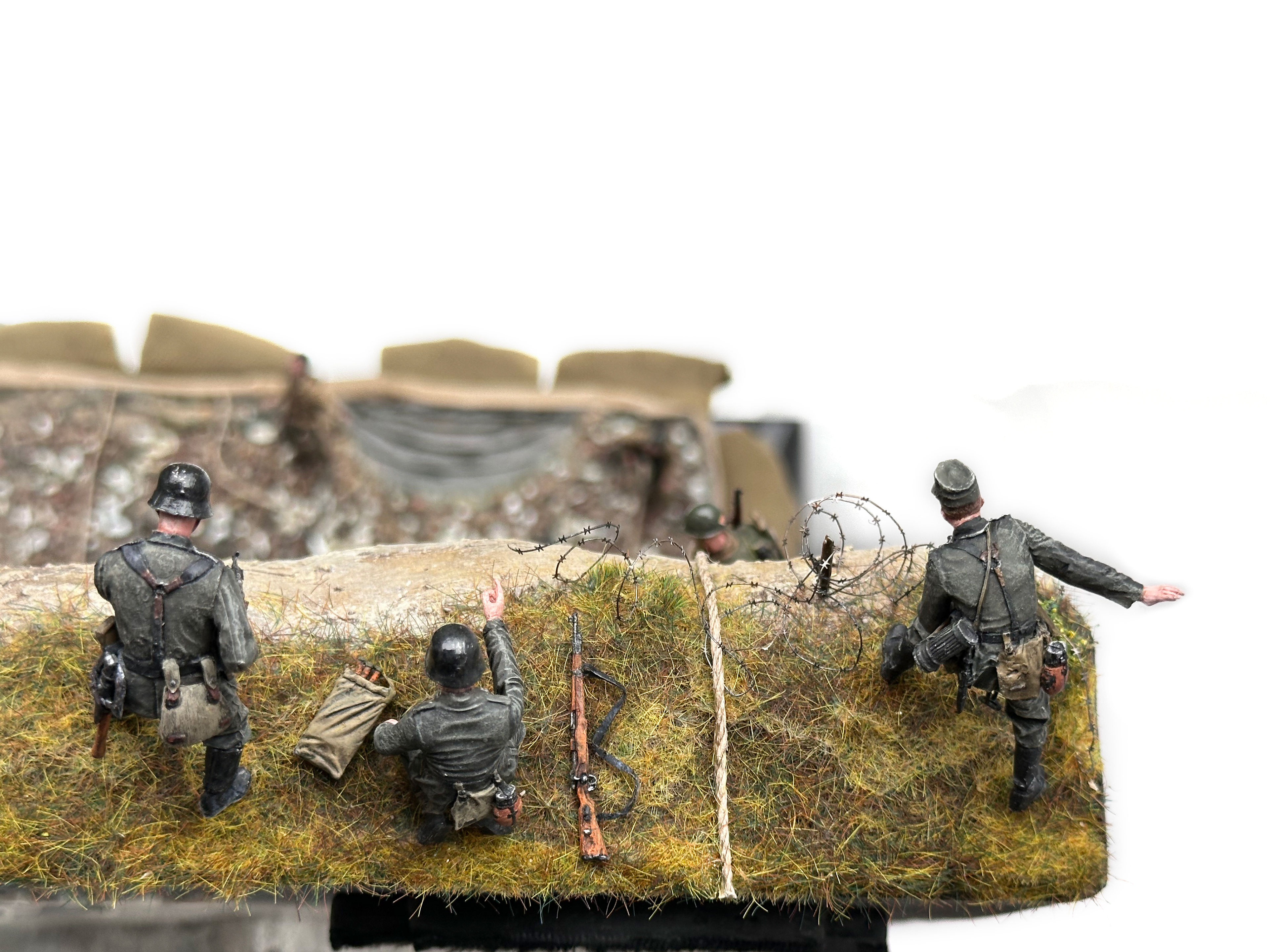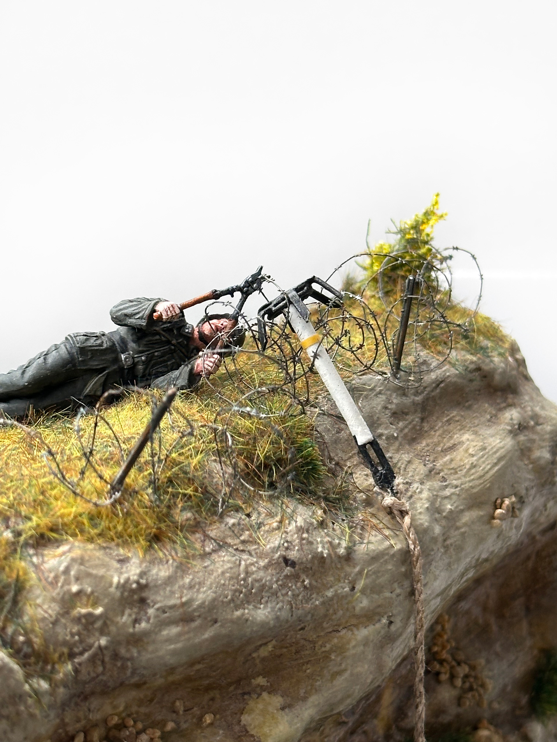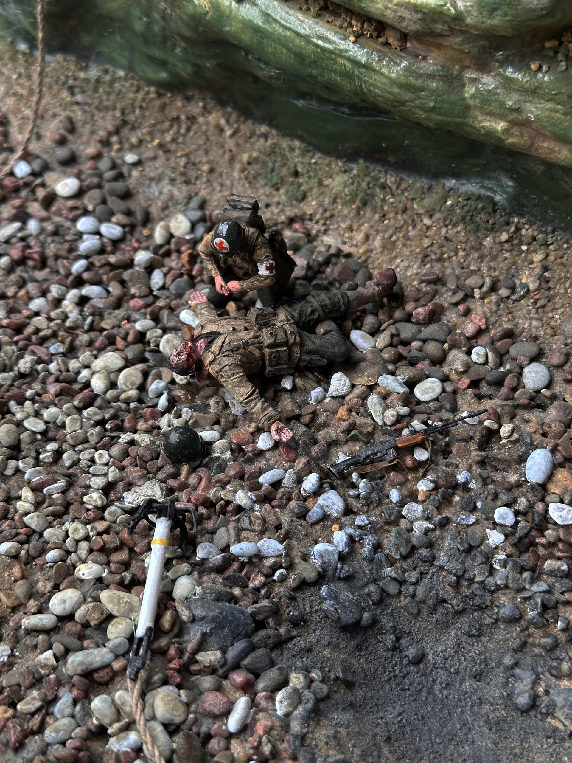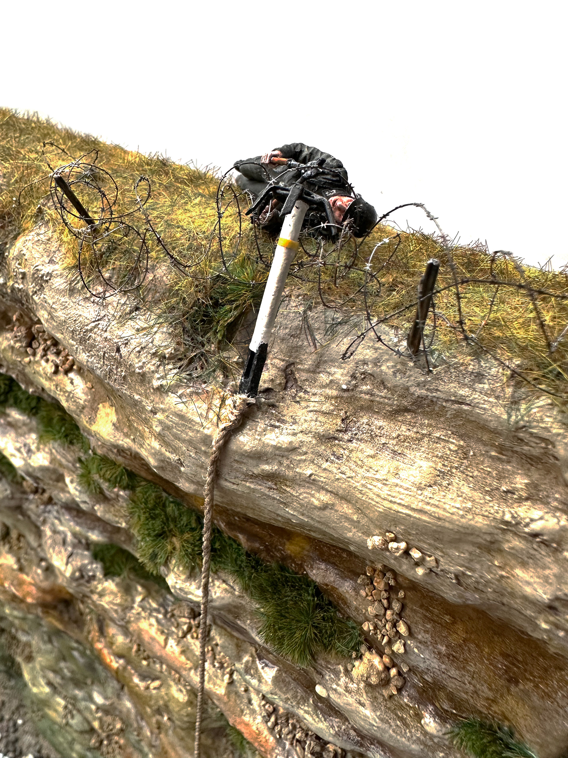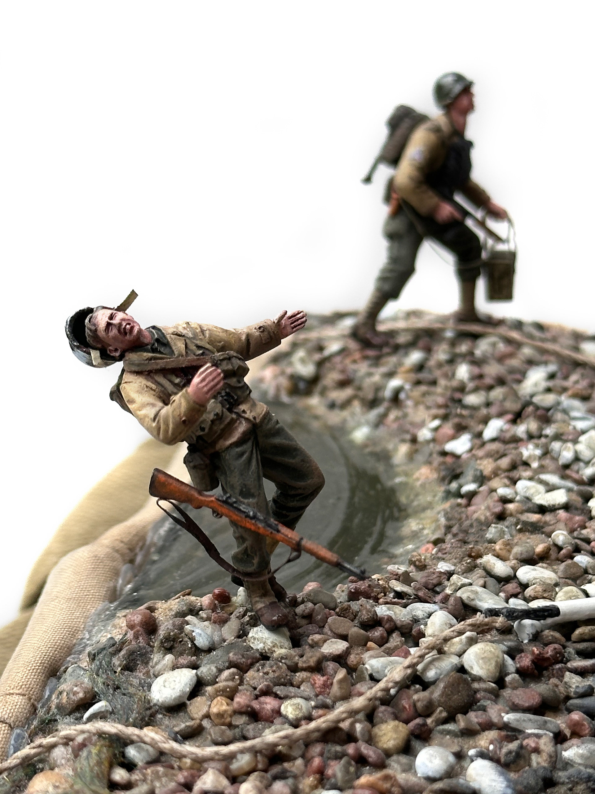 The base of the diorama involves a heavily used reproduction of an M1A1 Grand ammo belt and jacket garment material to represent that of a Rangers mid-section.