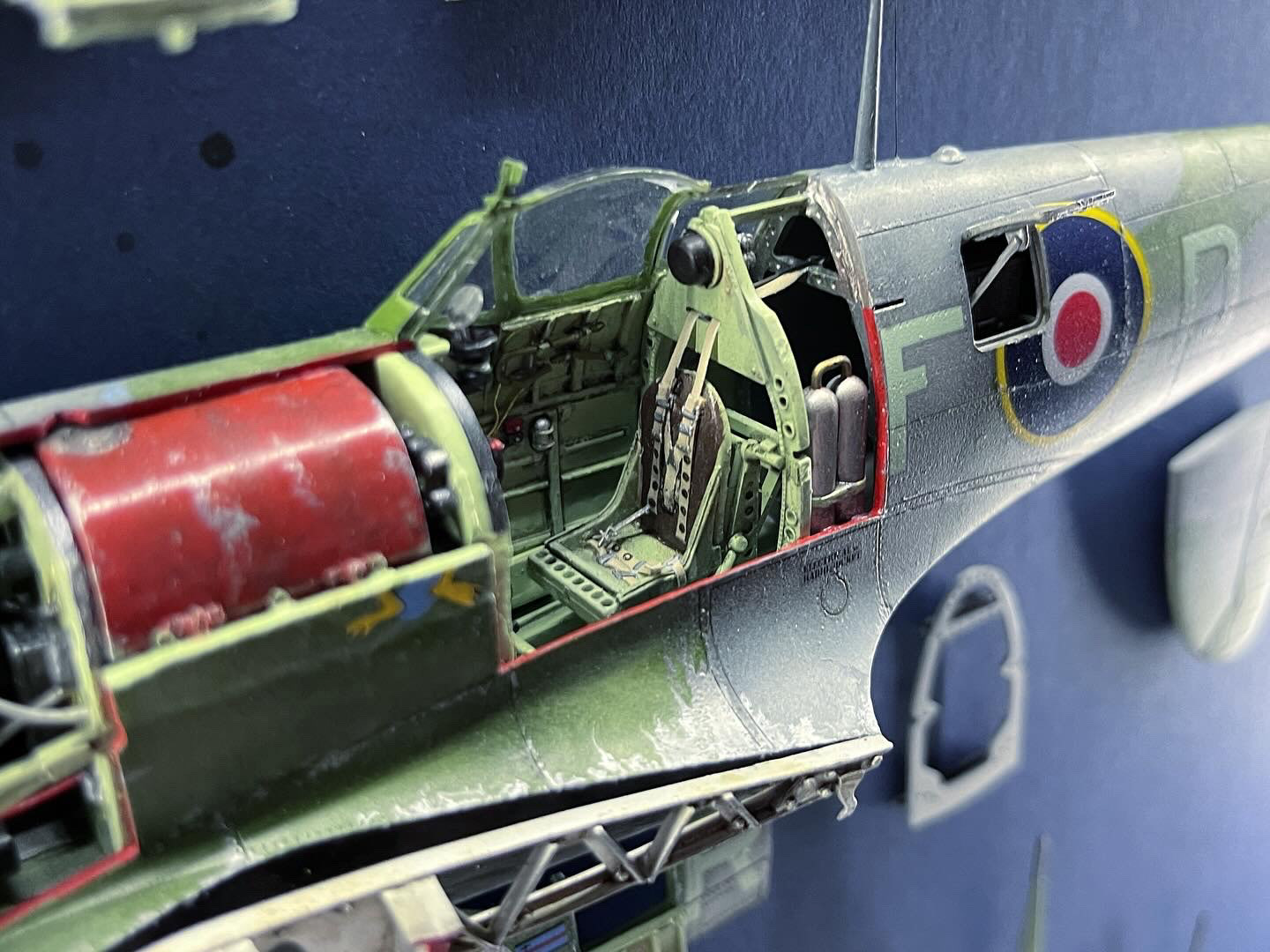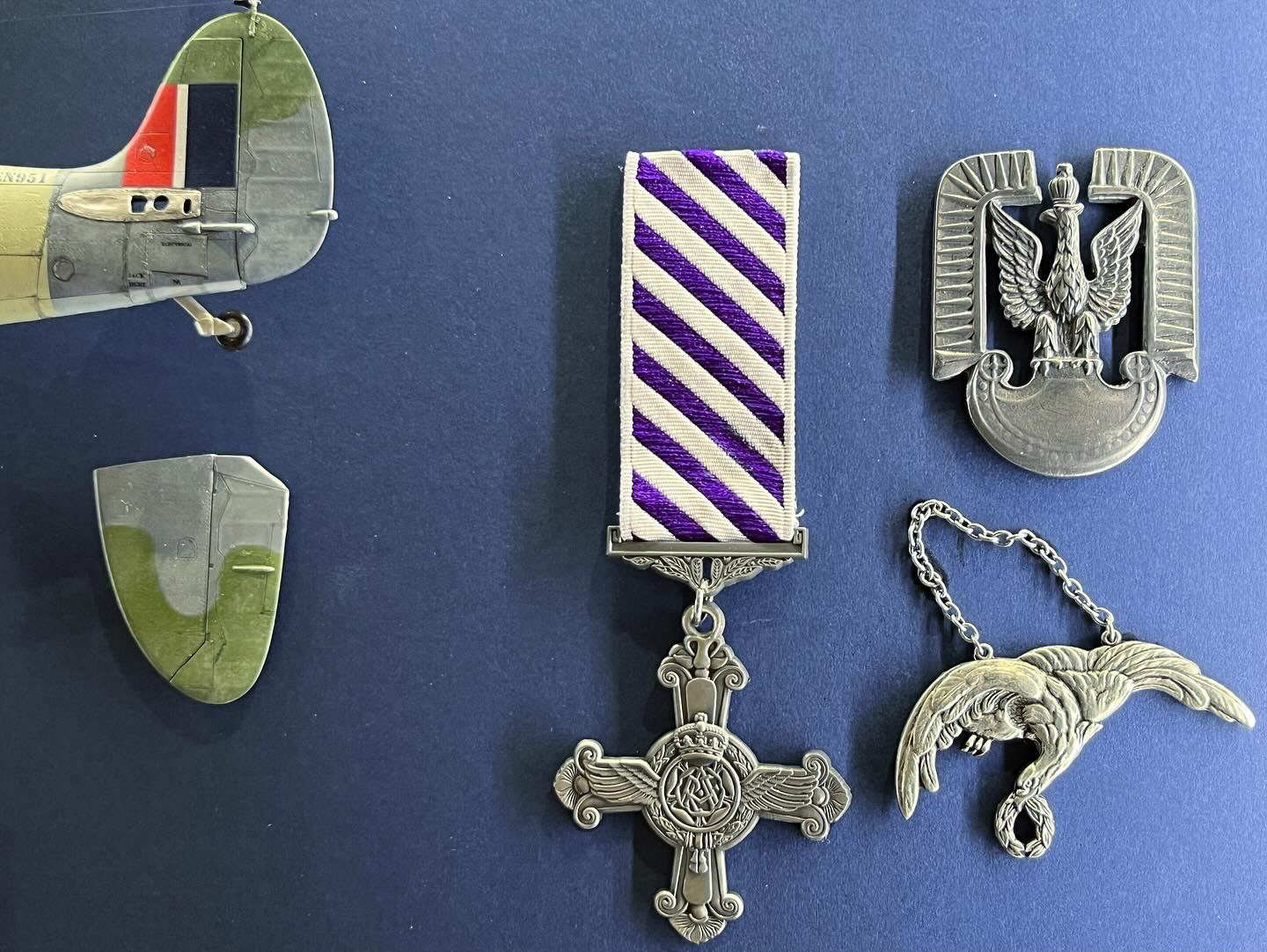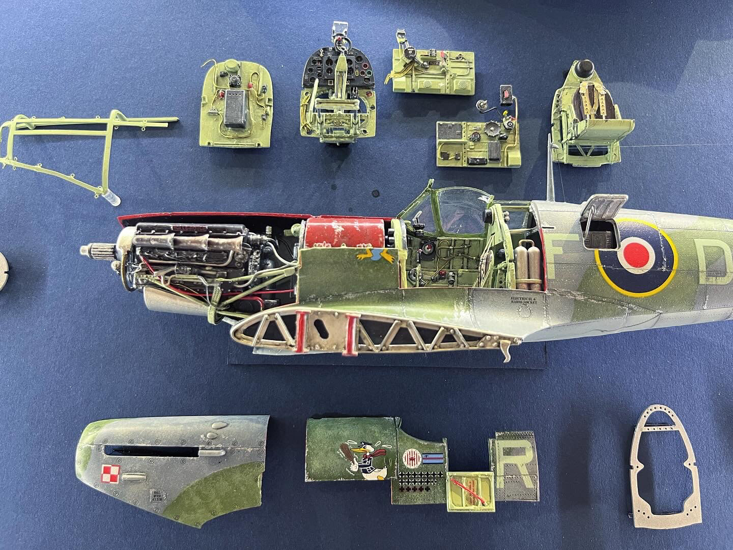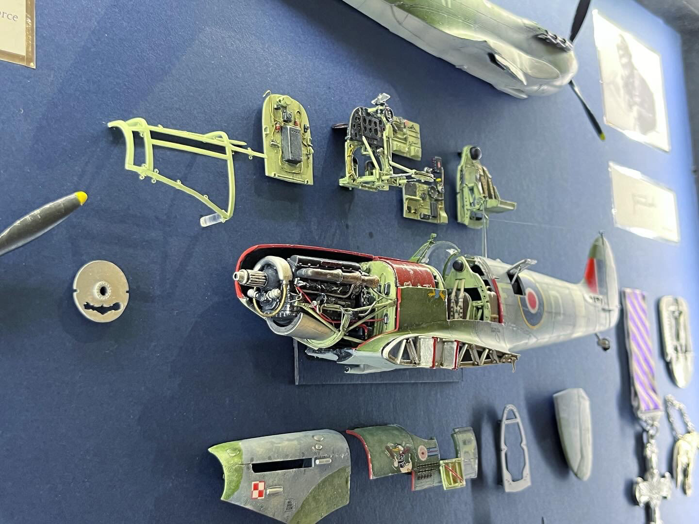 A framed deconstructed kit display of the Supermarine Spitfire EN95, No.303 (Polish Squadron) flown by Jan Zumbach