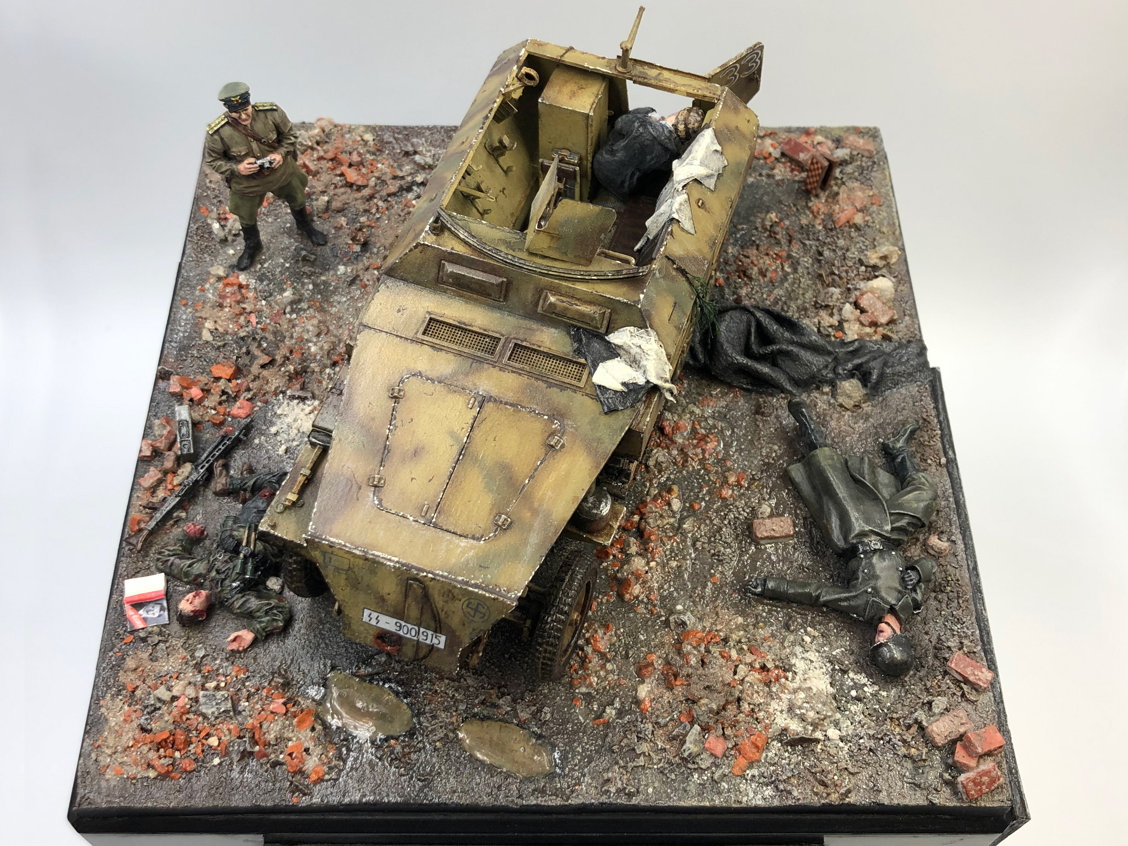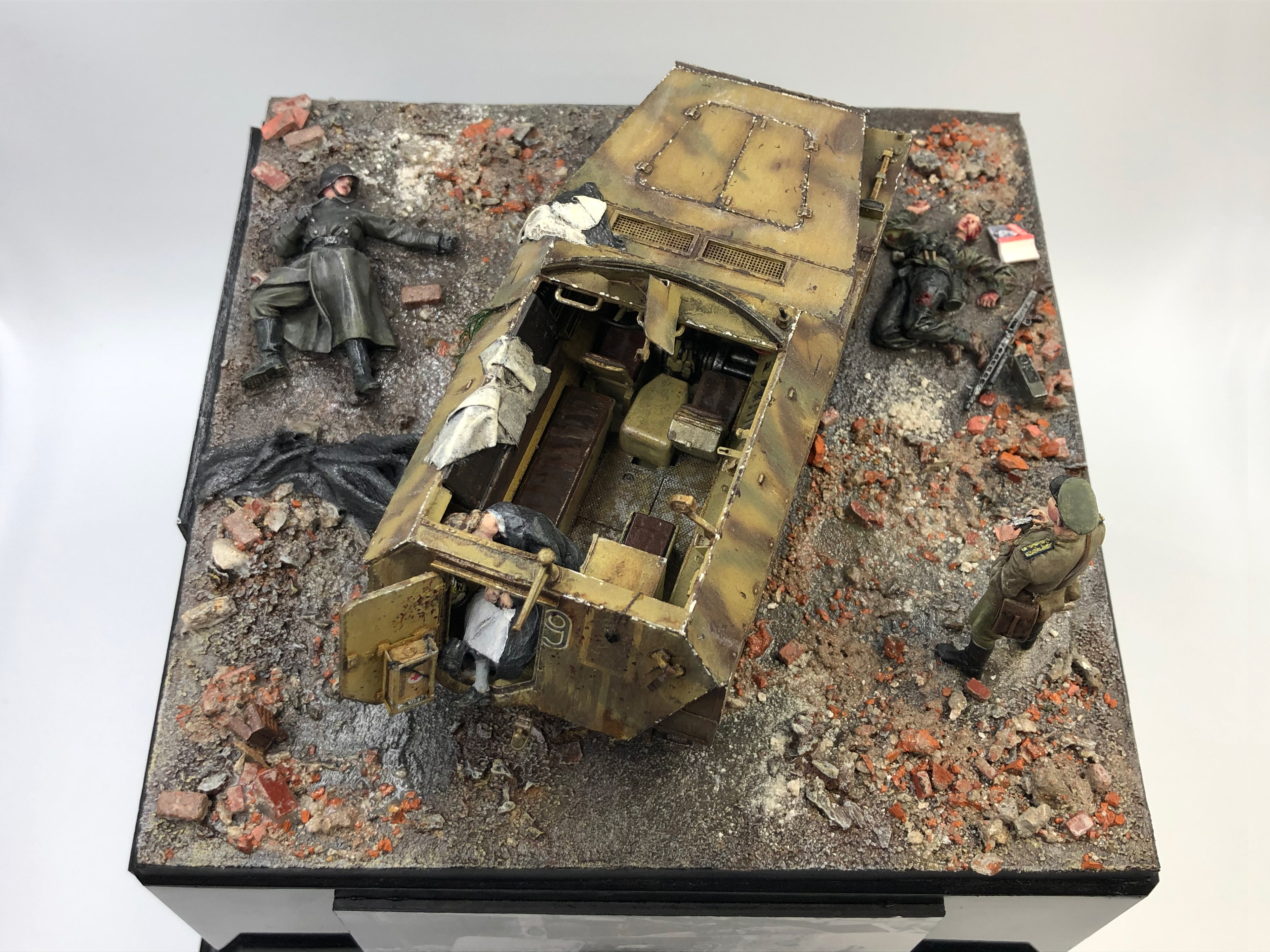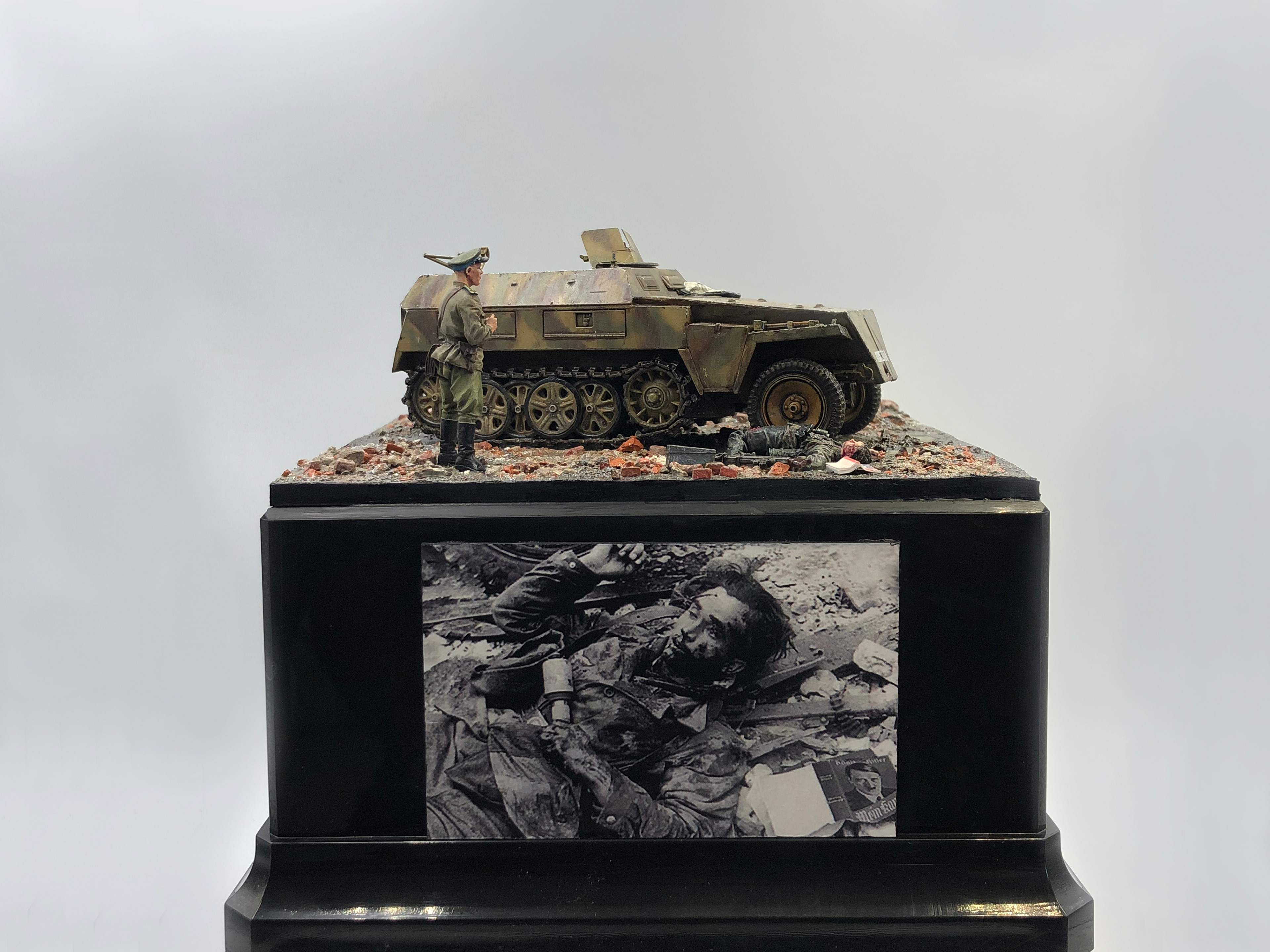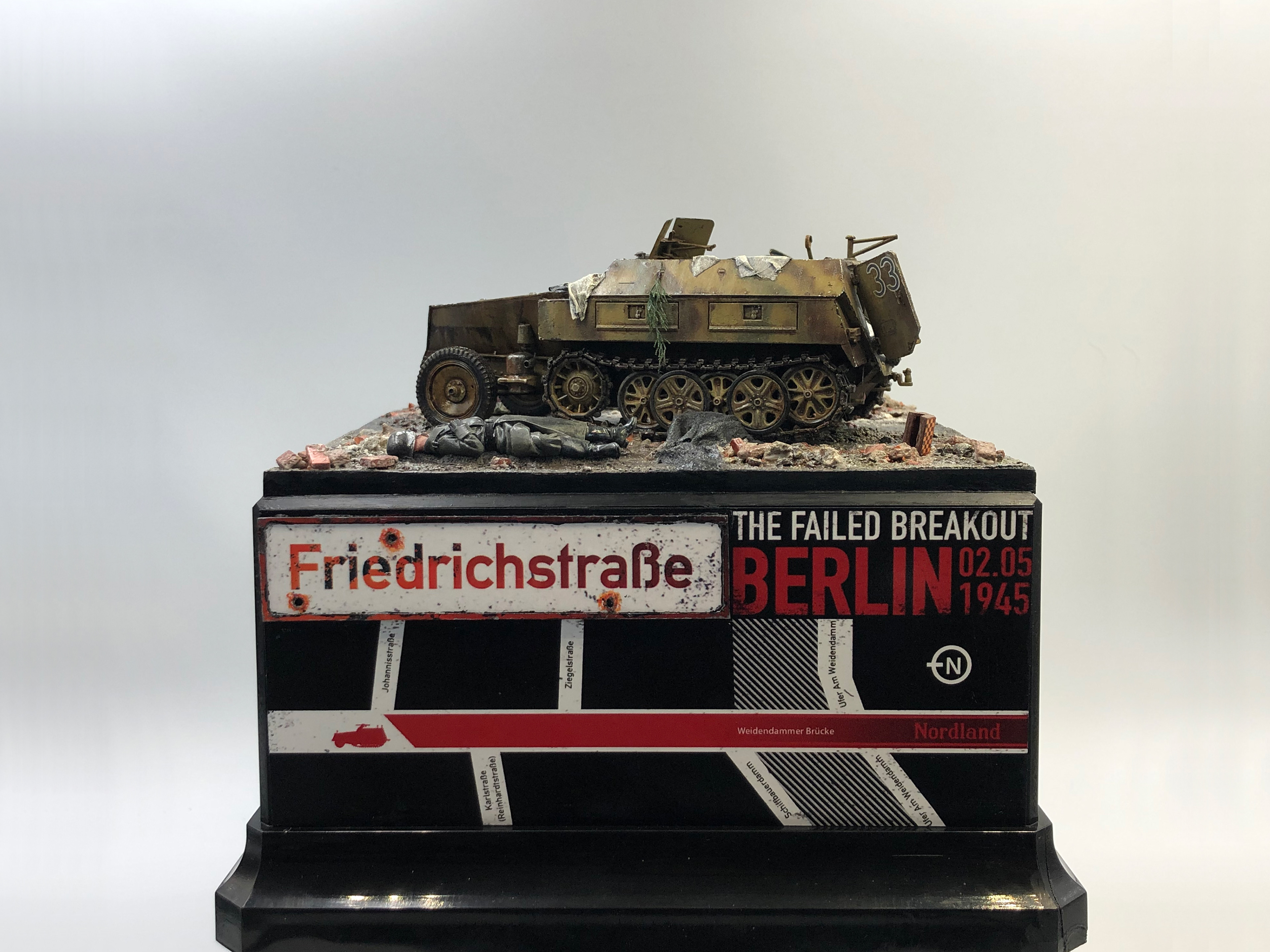 Vignette of a well-known photograph taken during the last days of the Battle of Berlin, 1945. The scene depicts a segment from the aftermath of failed breakout attempt along Friedrichstraße by the 11th SS Panzer Grenadier Division 'NORDLAND' in a desperate, last-ditch attempt to break out of the encircled city. The result was a massacre.